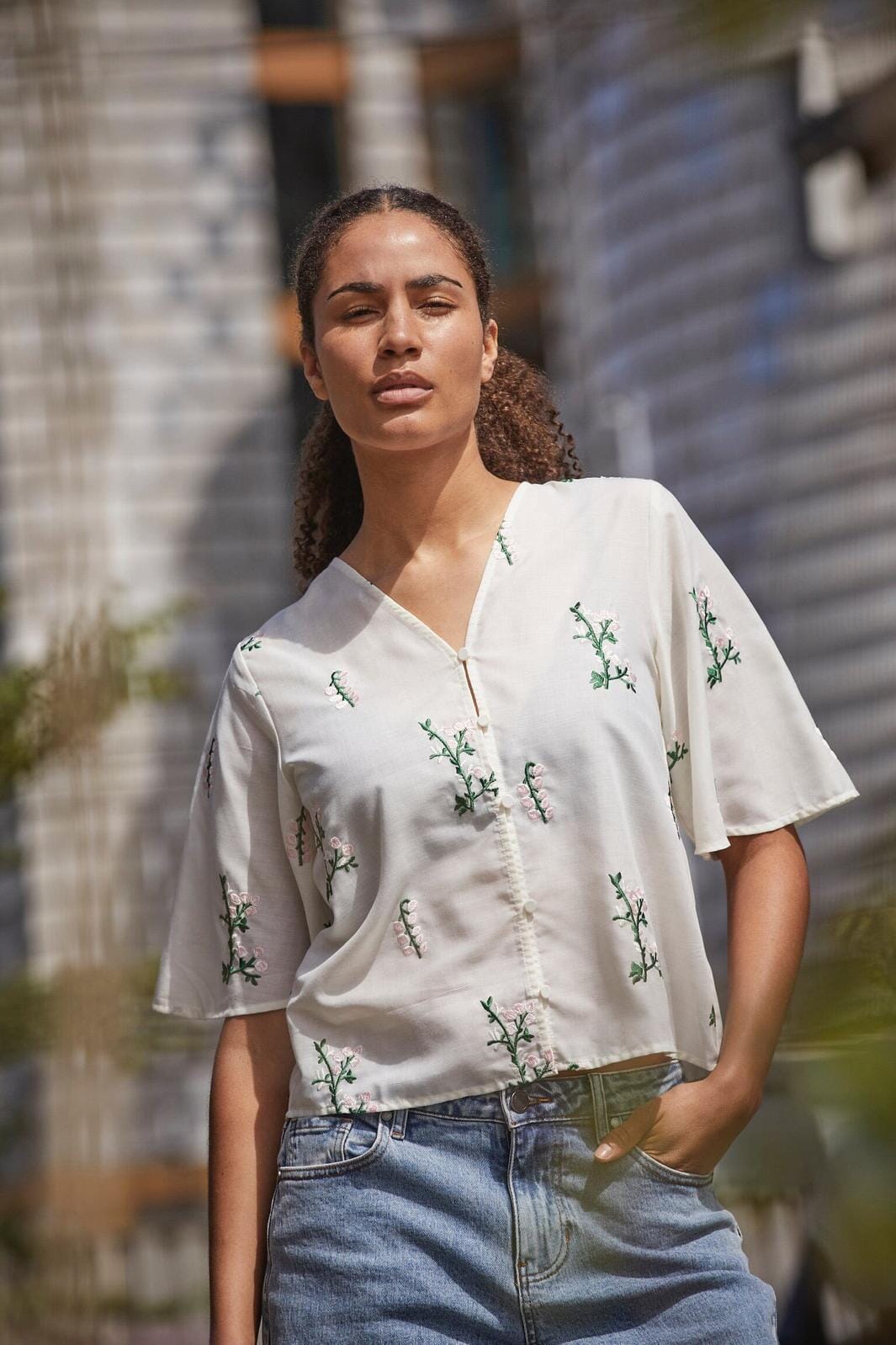 Cremefarbene Bluse von Love & Divine mit bestickten Blumen in Rosa und grünen Stielen. Die Bluse hat einen V-Ausschnitt, eine Knopfleiste vorne und breite, kurze Ärmel.