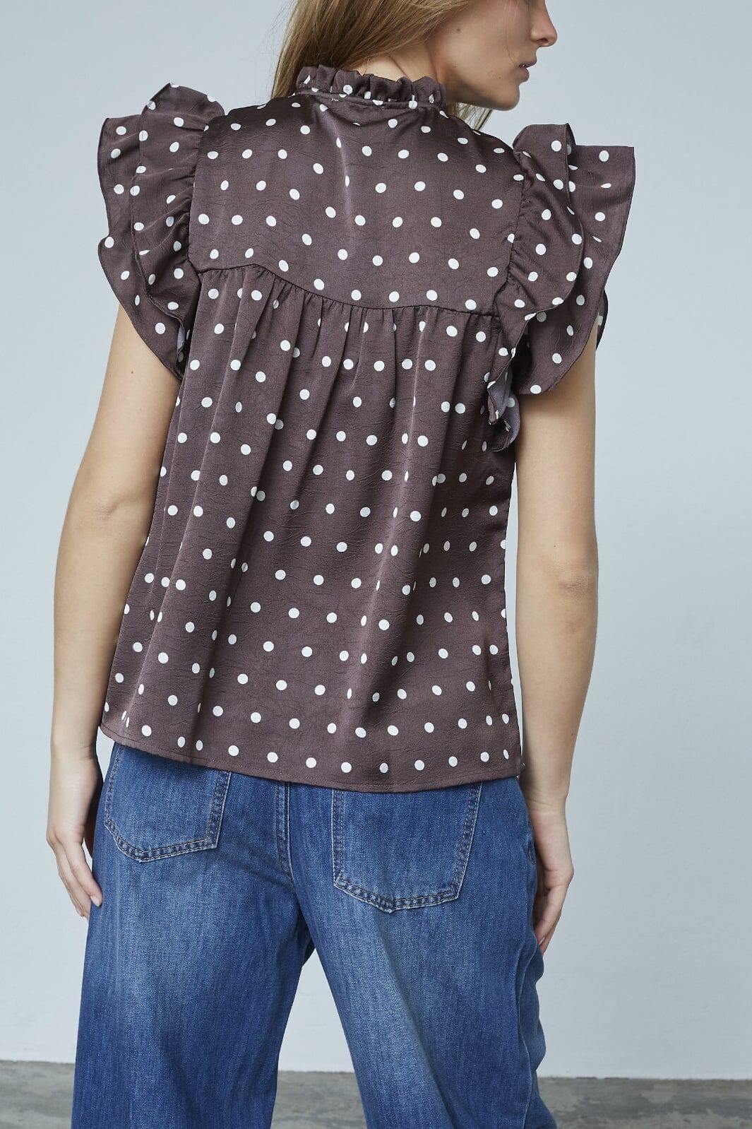 Braune Bluse von Love & Divine mit weißen Punkten. Die Bluse hat eine lockere Passform mit V-Ausschnitt und Rüschen an den Ärmeln und am Ausschnitt. Der leichte Stoff verleiht der Bluse einen sanften Fall.