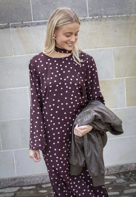 Langärmliges Kleid von Love & Divine in Bordeaux mit hellen Polka-Punkten. Das lange Kleid hat einen runden Ausschnitt und eine lockere Passform mit Schlitz an der Seite.