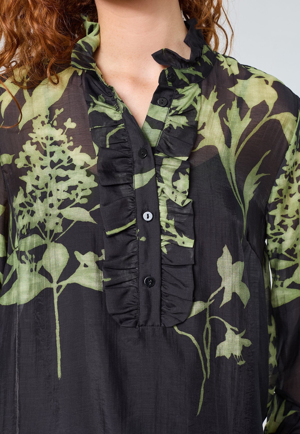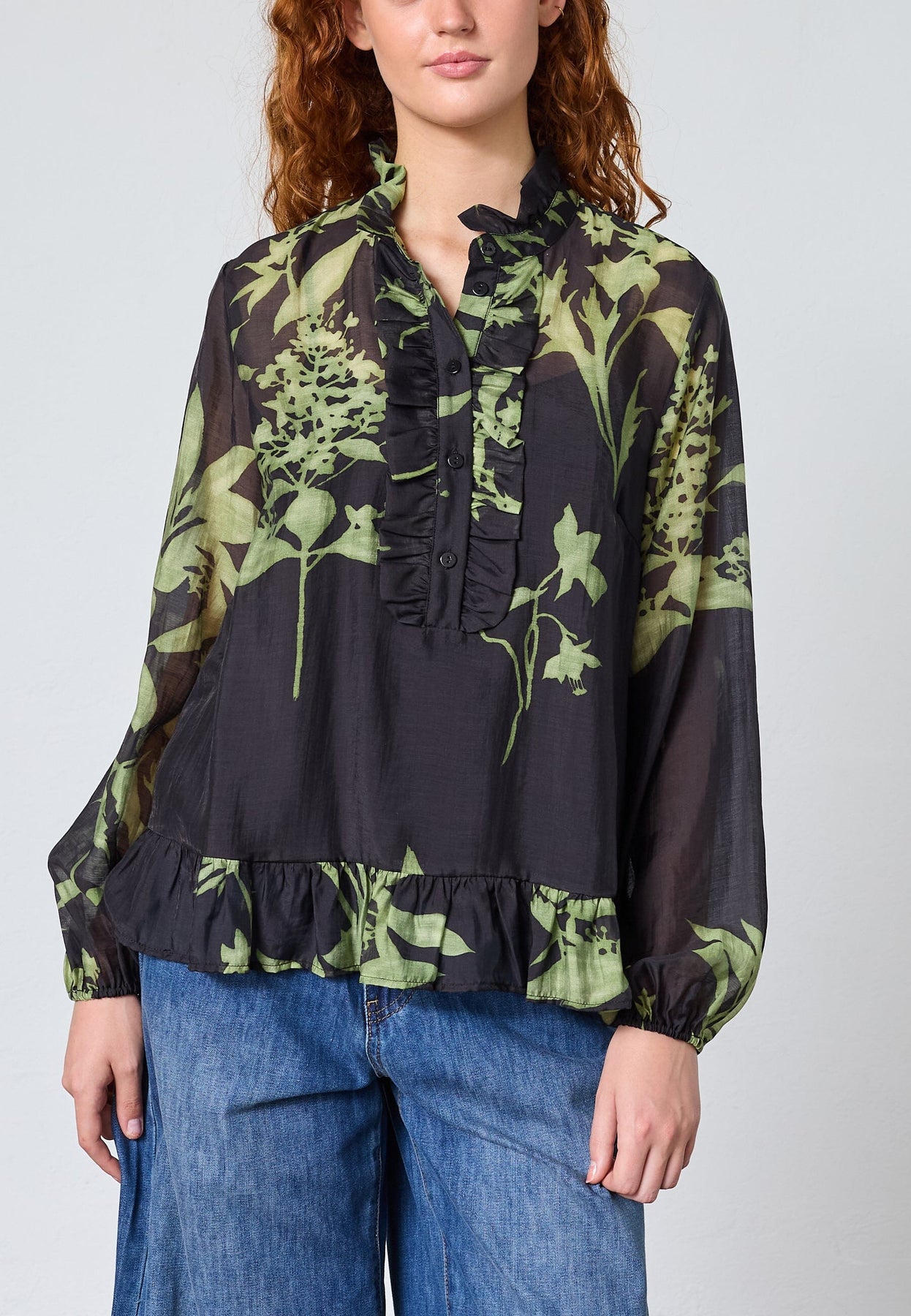 Bluse von Love & Divine mit hohem Kragen und grünem Blumenprint auf dunklem Hintergrund. Die Bluse hat Rüschen-Details am Kragen und lange, geraffte Ärmel.