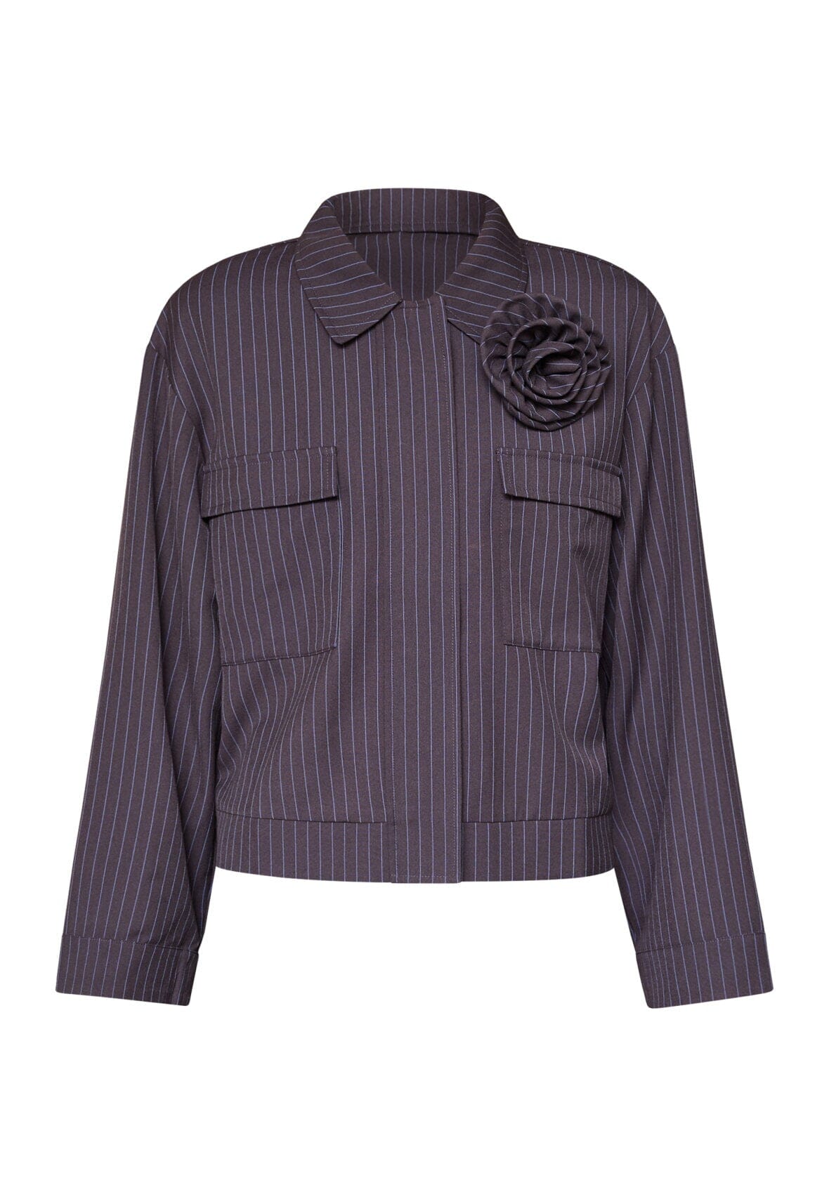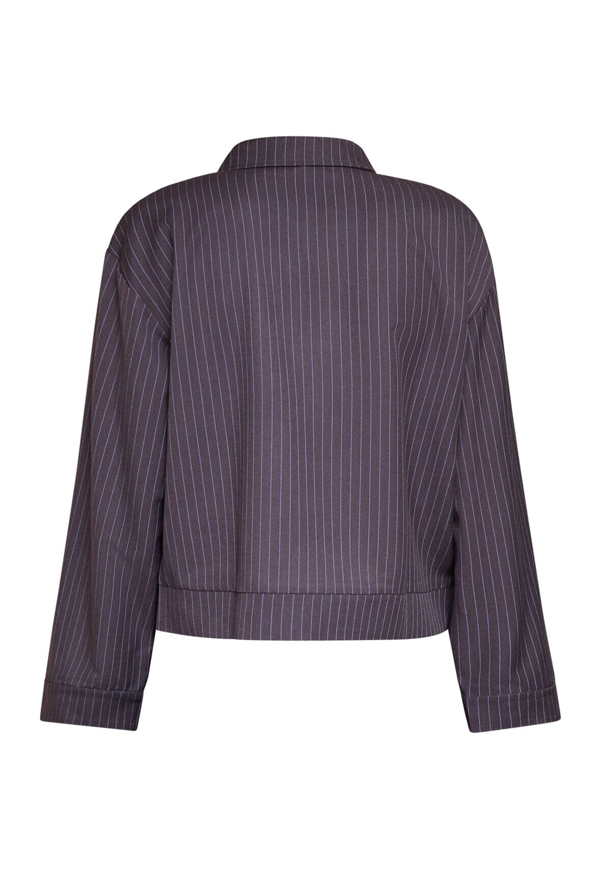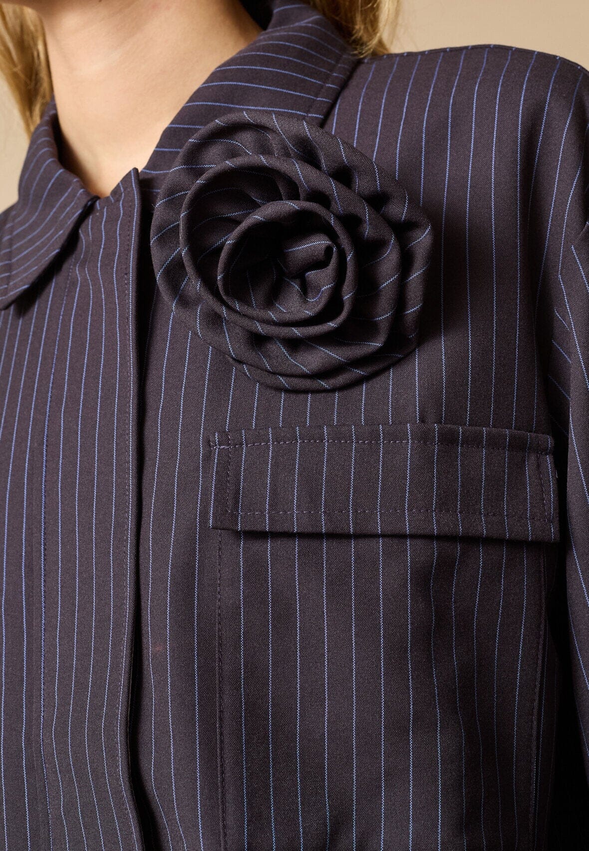 Blaues Pinstripe-Hemd von Love & Divine mit vertikalen Streifen in dunkelblauen Nuancen. Das Hemd hat einen klassischen Hemdkragen, lange Ärmel und zwei Brusttaschen auf der Vorderseite.