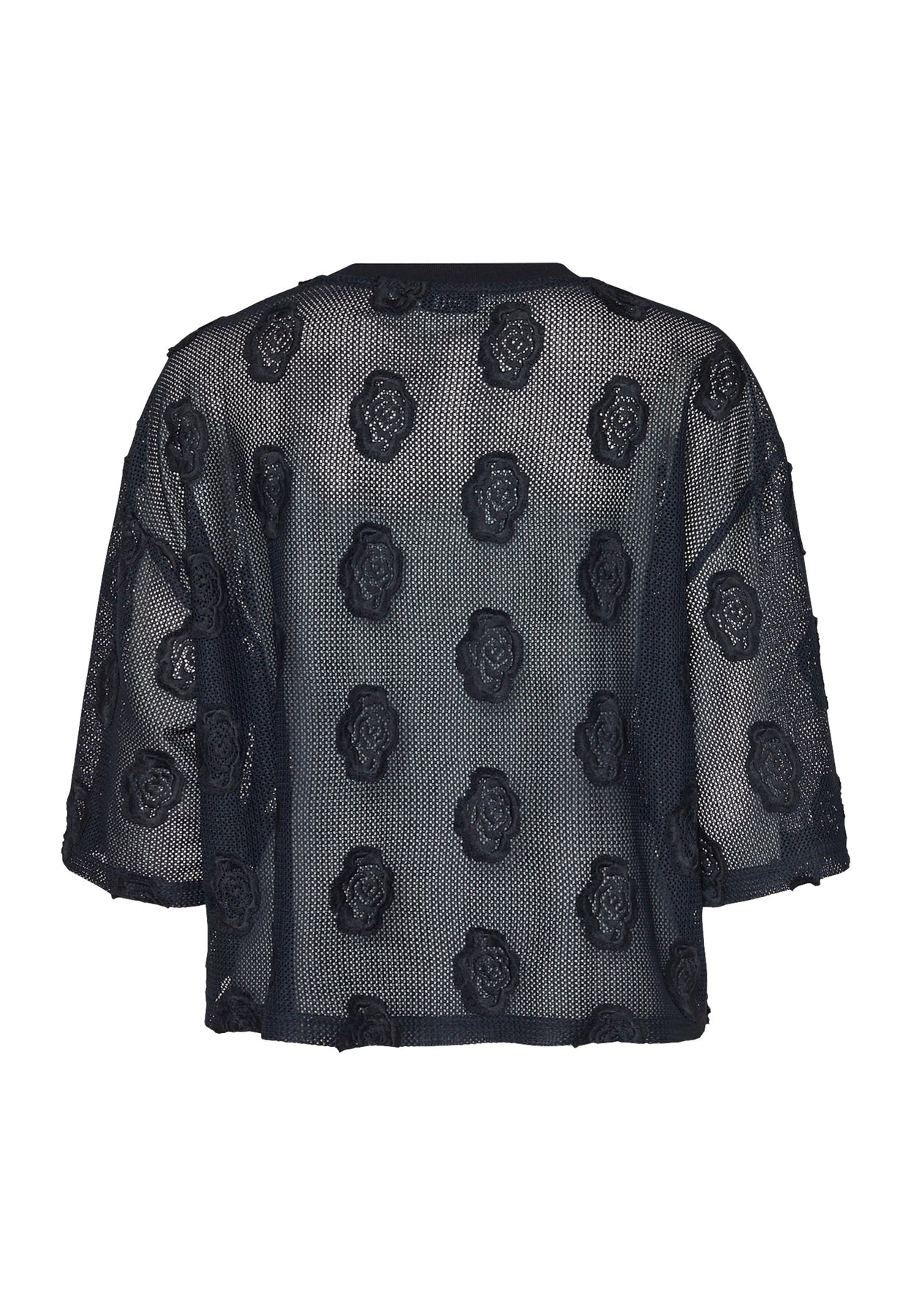 Schwarze Bluse von Love & Divine aus Mesh mit blütenähnlichen Applikationen. Die Bluse hat kurze, weite Ärmel und einen runden Halsausschnitt.