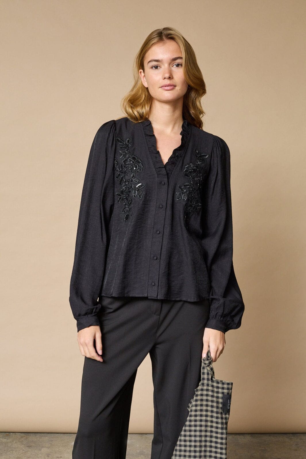 Schwarze Bluse von Love & Divine mit Blumenstickerei, Pailletten und Rüschen auf der Vorderseite. Sie hat einen gerafften Kragen am V-Ausschnitt und lange Ärmel mit Manschetten.