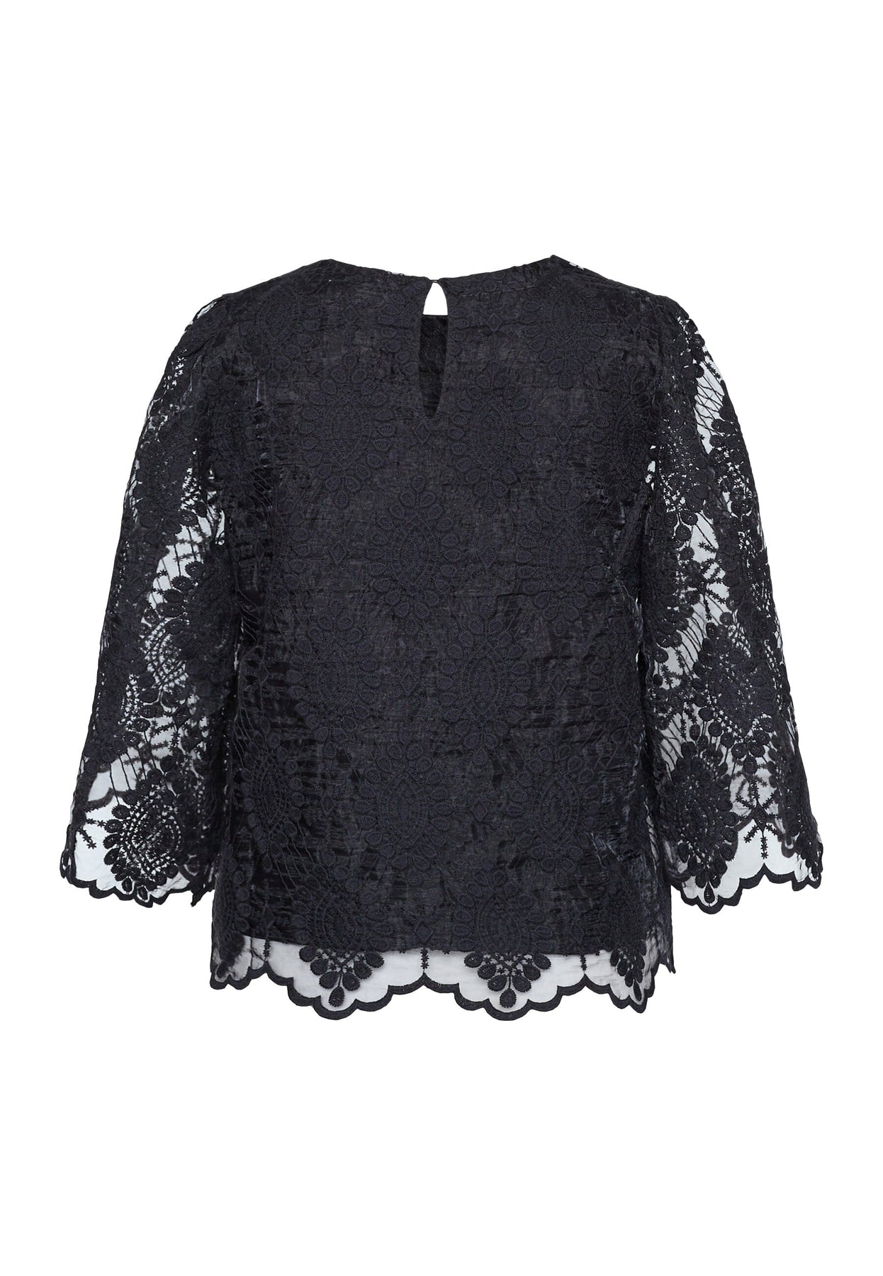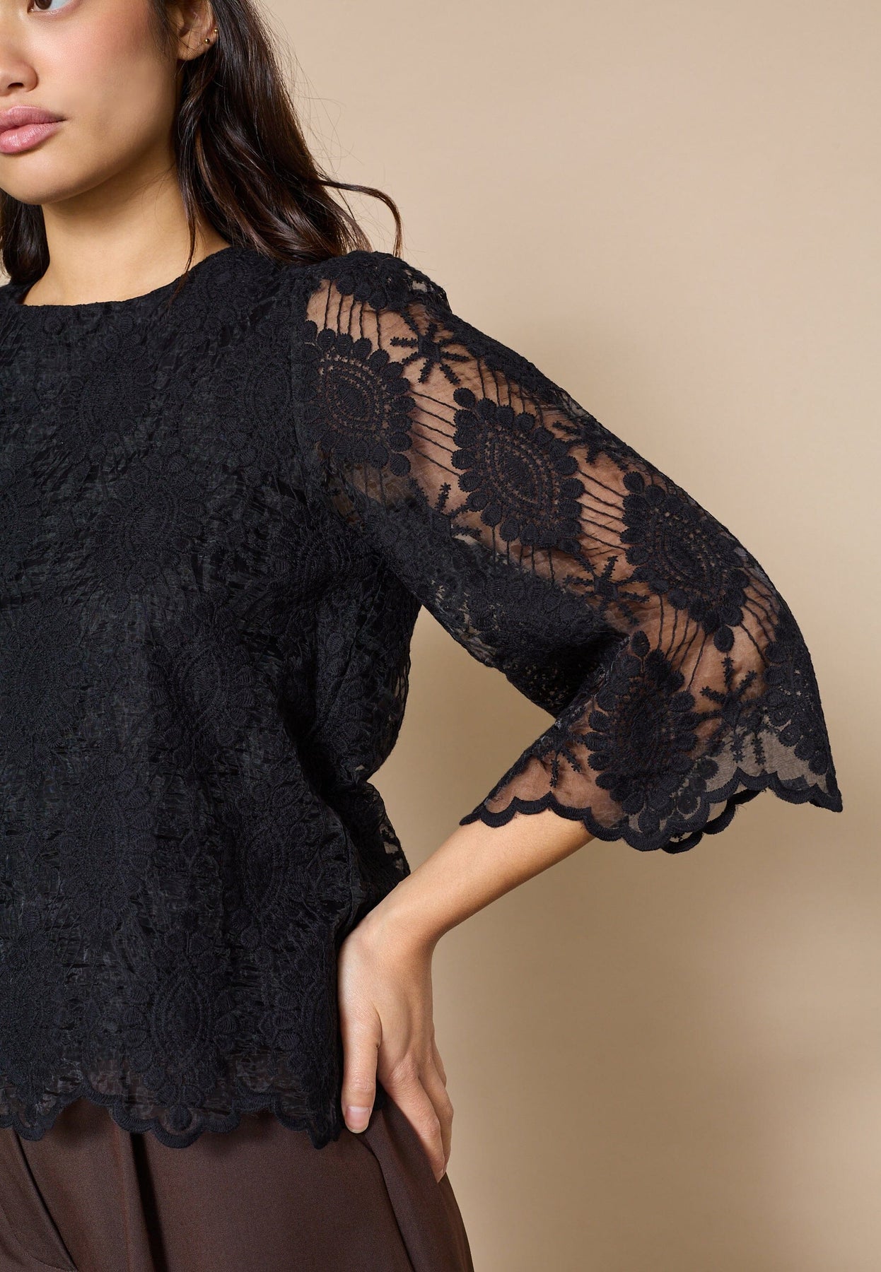 Schwarze Spitzenbluse von Love & Divine, aus 100 % Polyester mit floraler Spitzengestaltung und dreiviertellangen Ärmeln mit Spitzenmuster.