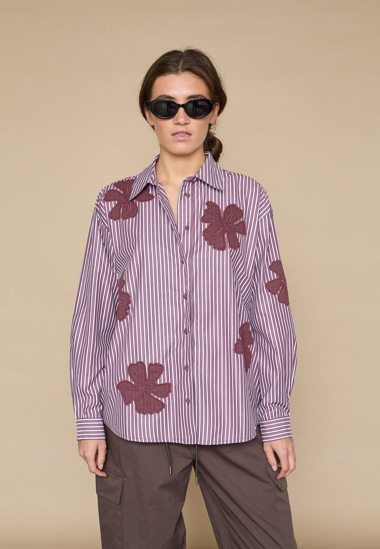 Gestreifte Bluse von Love & Divine mit großen Blumenapplikationen in Bordeaux. Die Bluse hat einen klassischen Kragen und eine Knopfleiste.