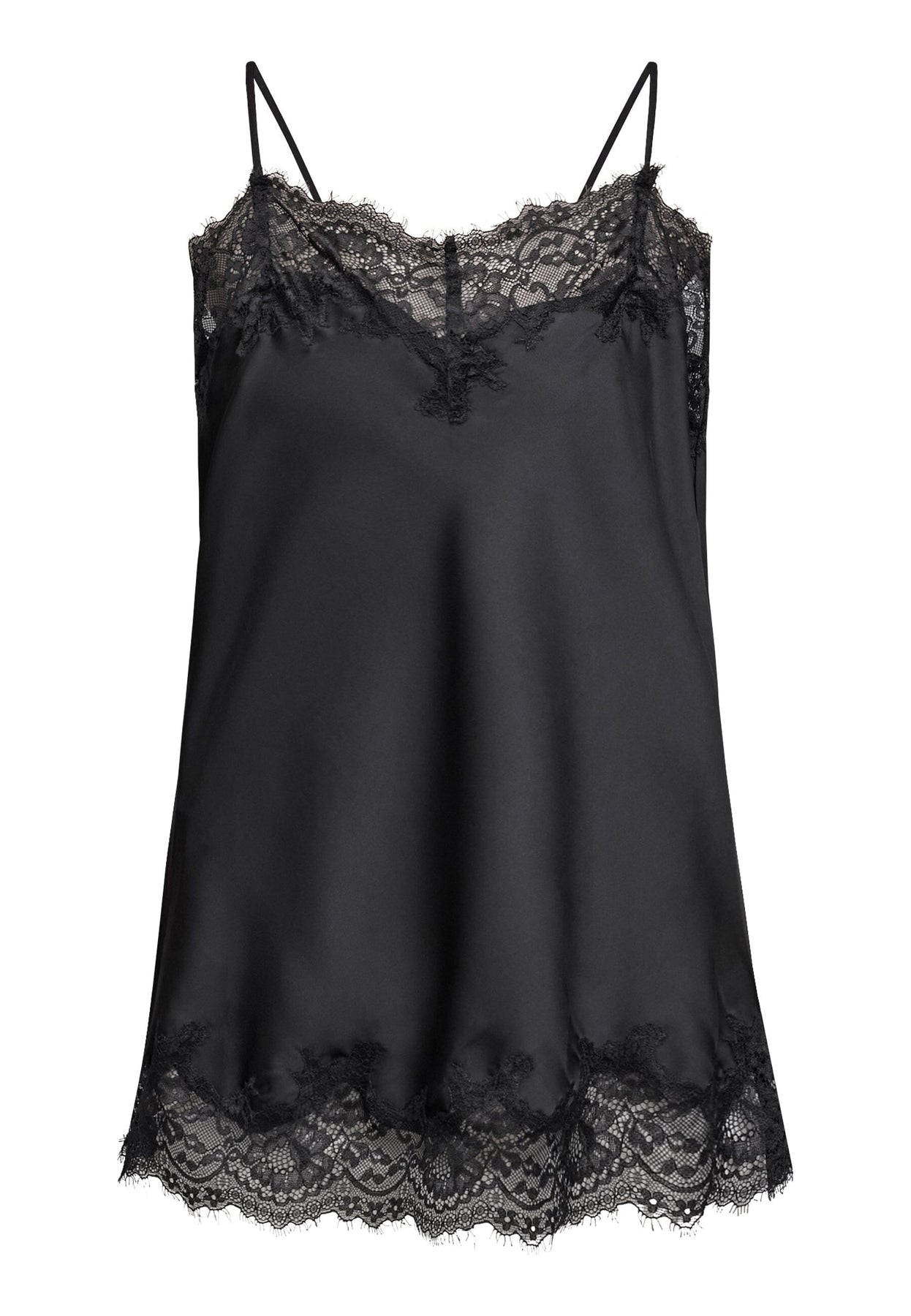 Schwarzes Top von Love & Divine mit dünnen Spaghettiträgern und Spitzenkanten. Das Top hat einen V-Ausschnitt und eine lockere Passform.