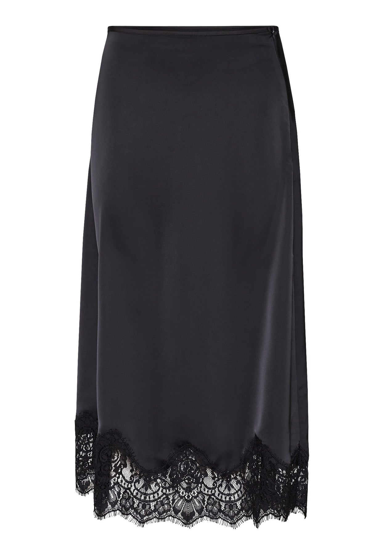 Schwarzer Rock von Love & Divine mit Spitze entlang des Saums. Der Rock hat eine glatte Oberfläche mit leicht glänzendem Finish und reicht bis zur Mitte der Wade.
