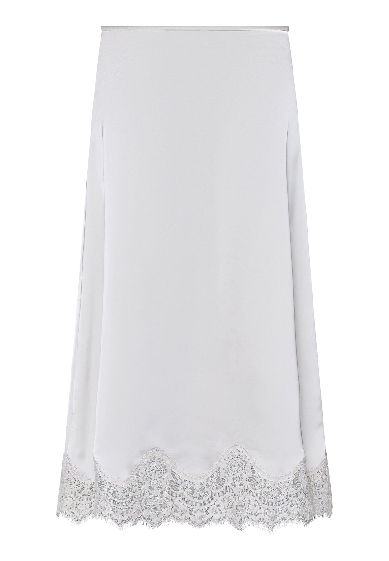 Ein langer Rock von Love & Divine in weißer und cremefarbener Nuance. Der Rock hat eine glatte, glänzende Oberfläche mit Spitzenkante entlang des Saums.