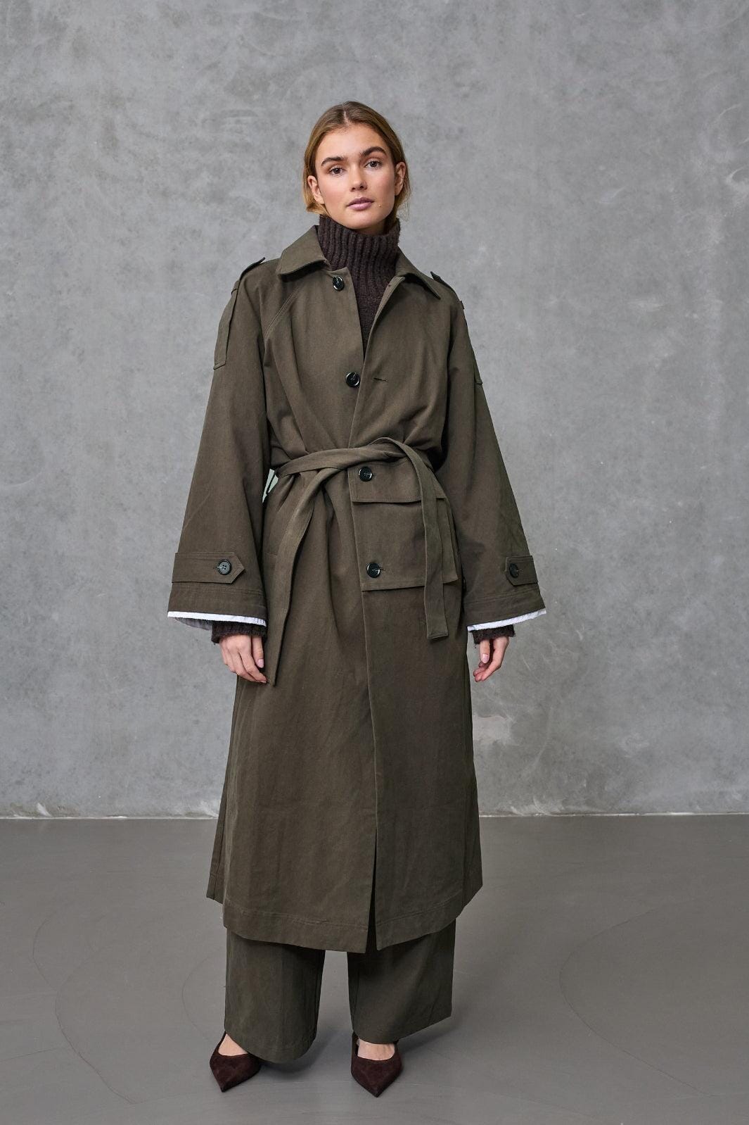 Brauner Mantel von Love & Divine aus 100 % Baumwolle. Der Mantel hat eine lange Passform mit Knöpfen vorne und Bindegürtel in der Taille.