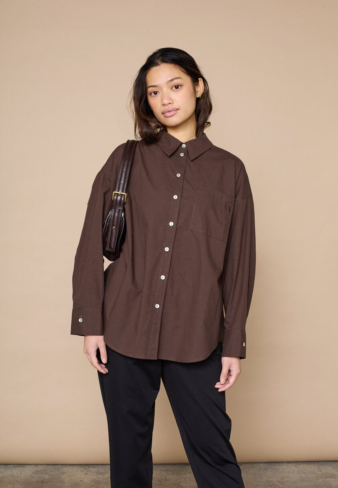 Braunes Hemd von Love & Divine mit Stickerei auf der Brusttasche. Das Hemd hat eine oversized Passform, lange Ärmel und eine Knopfleiste vorne.
