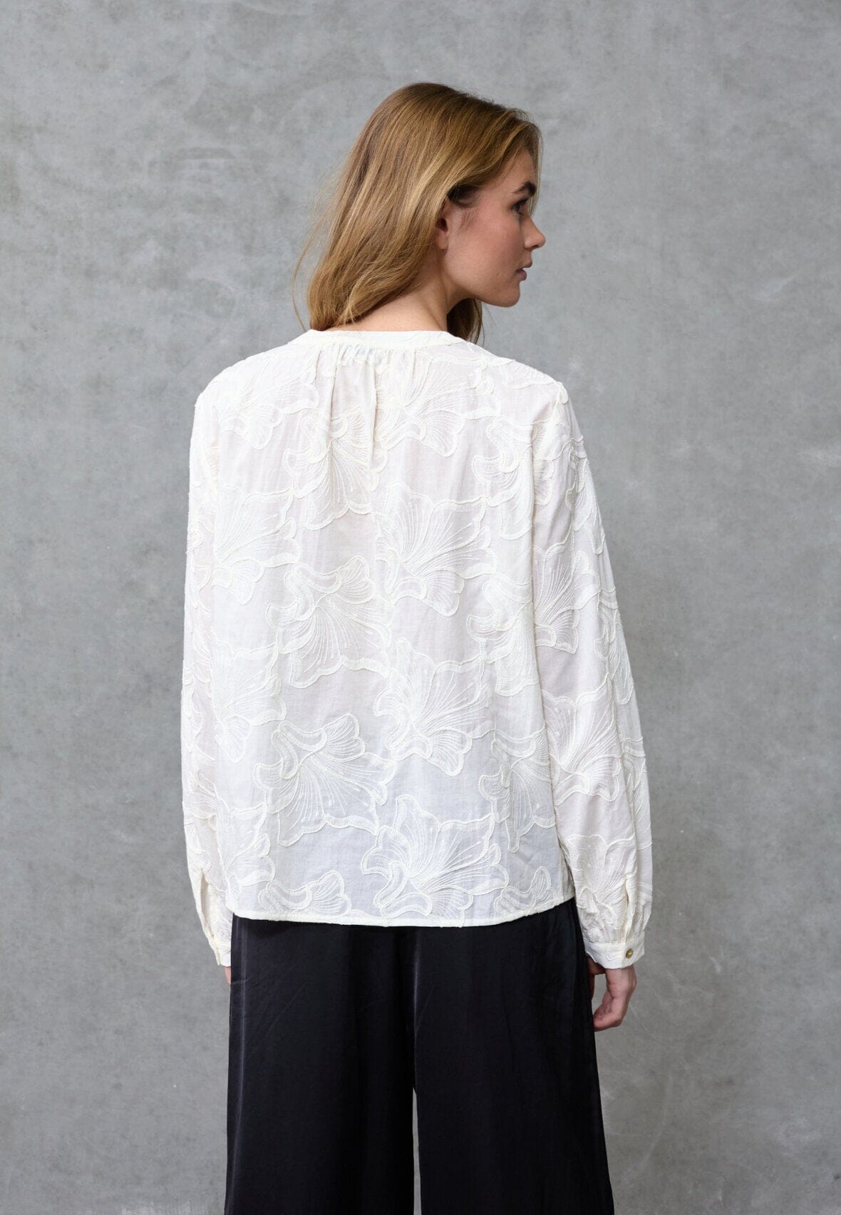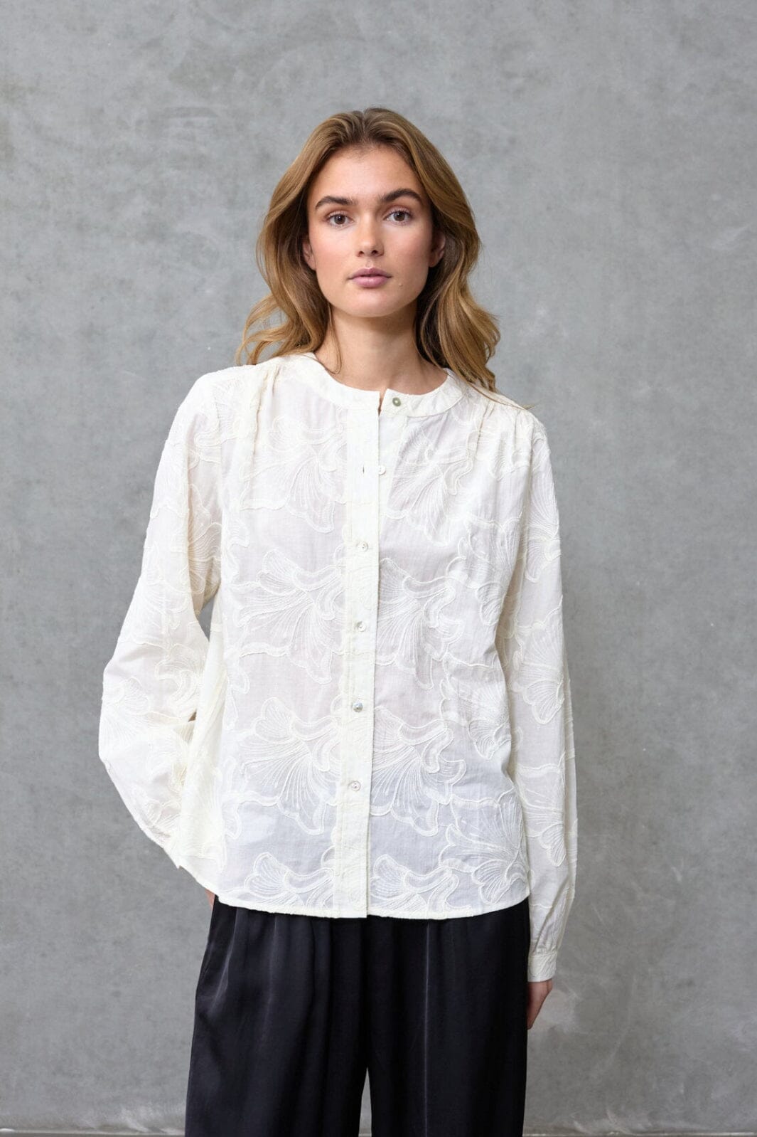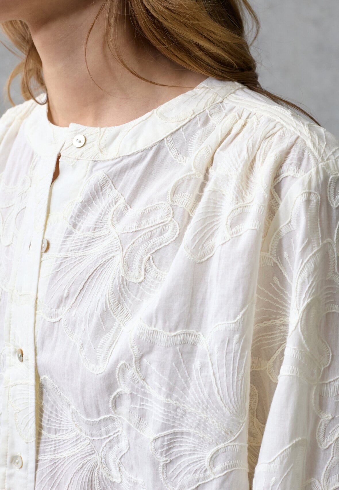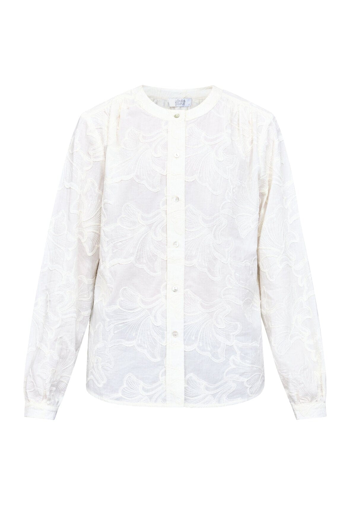 Cremefarbenes Hemd von Love & Divine mit gesticktem Blumenmuster. Das Hemd hat eine durchgehende Knopfleiste vorne und eine lockere Passform.