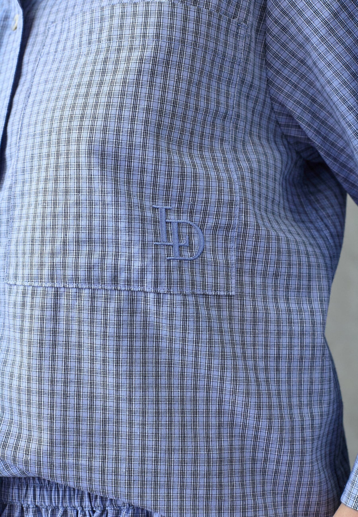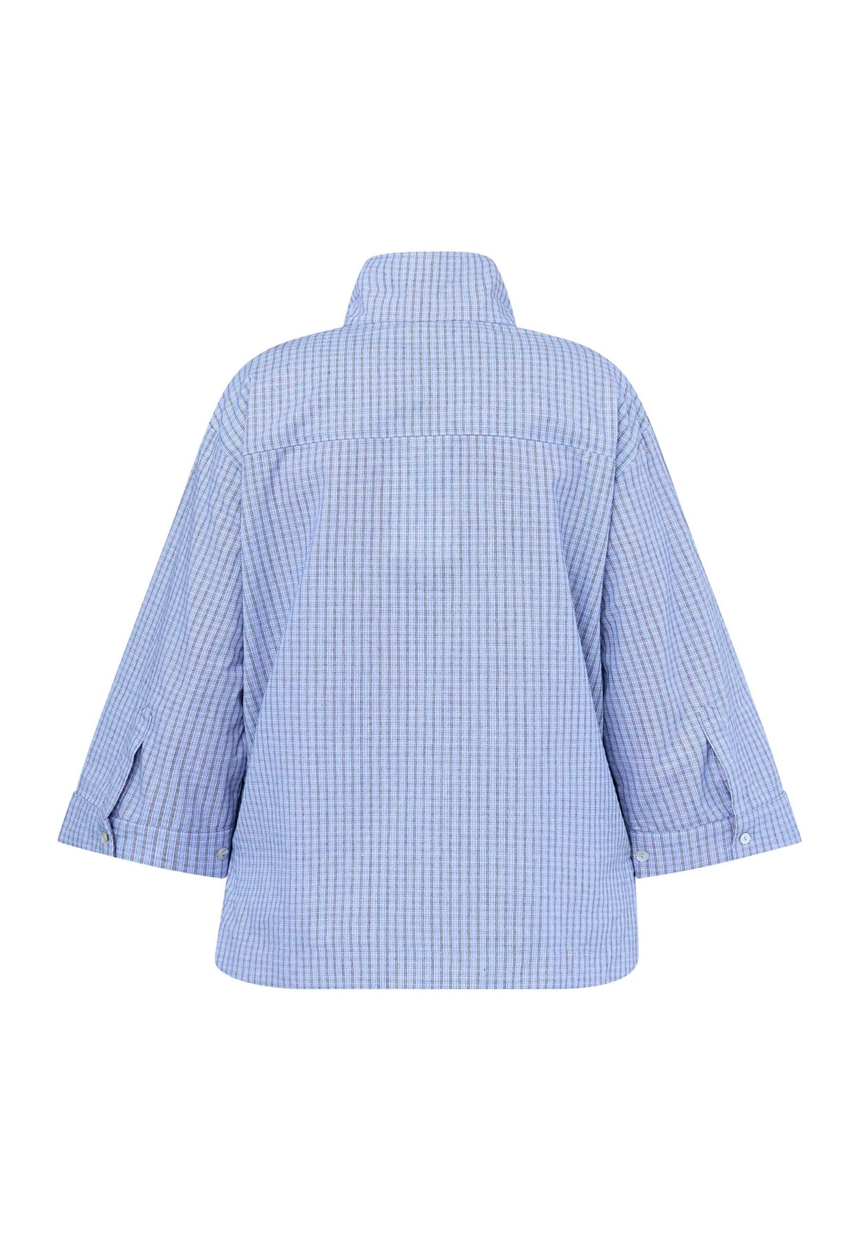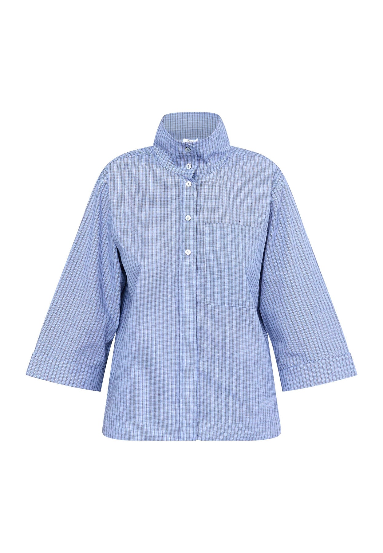 Blau karierte Bluse von Love & Divine aus 100 % Baumwolle. Die Bluse hat einen Kragen und eine Knopfleiste vorn mit einem karierten Muster in Blautönen.