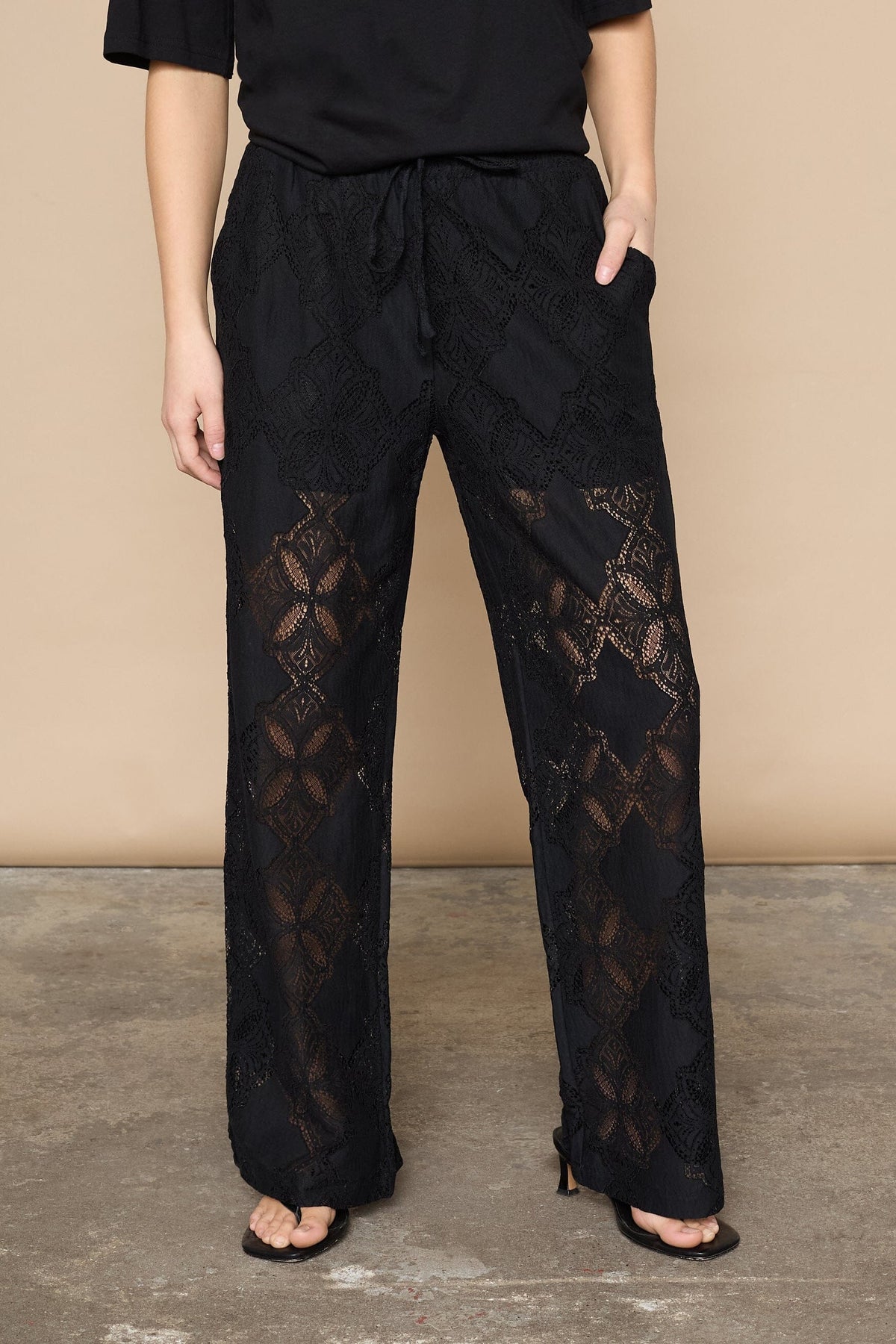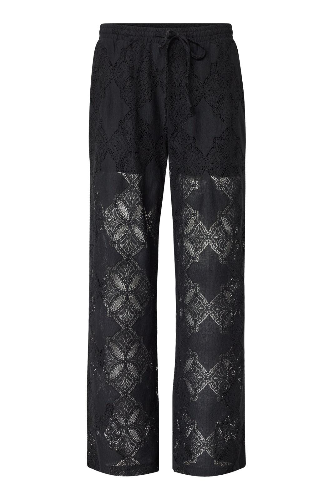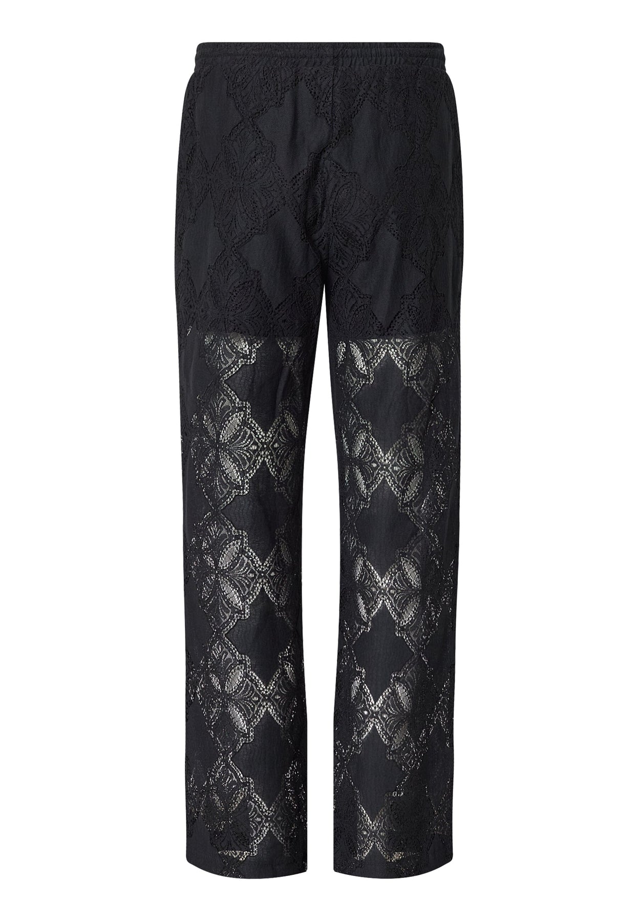 Schwarze Hose von Love & Divine mit transparentem Spitzendessin. Die Hose hat eine normale Leibhöhe und reicht bis zum Knöchel.