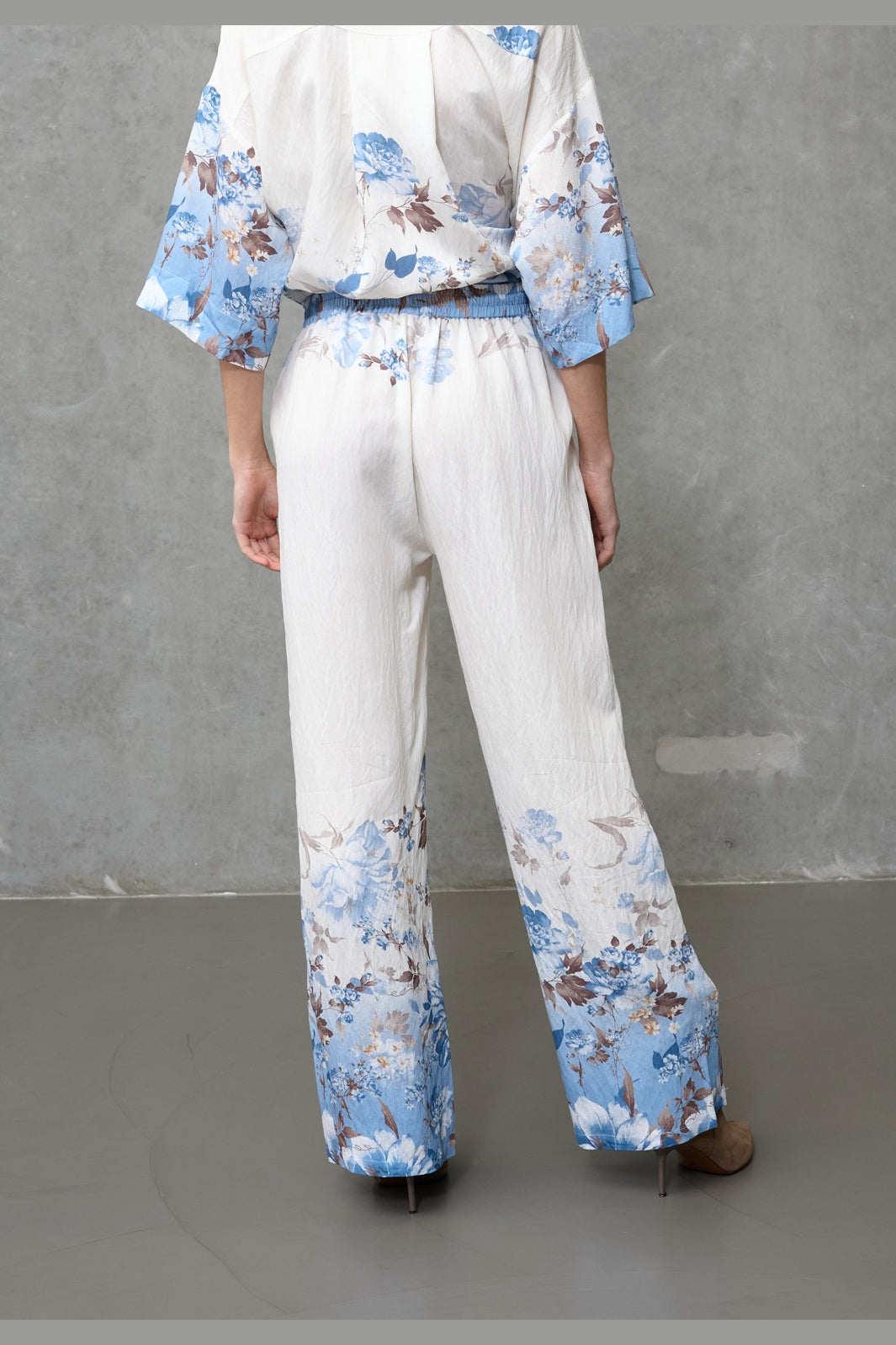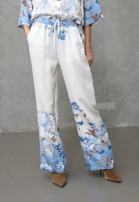 Hose von Love & Divine mit Blumenprint in blauen und braunen Nuancen. Die Hose hat eine lockere Passform und reicht bis zum Knöchel.