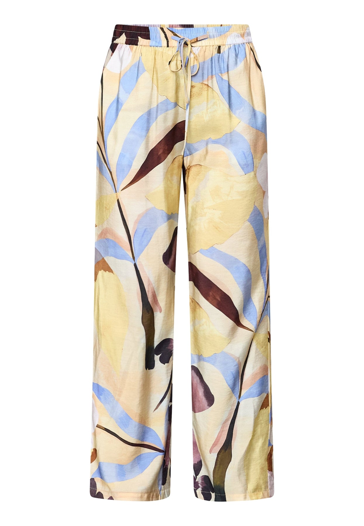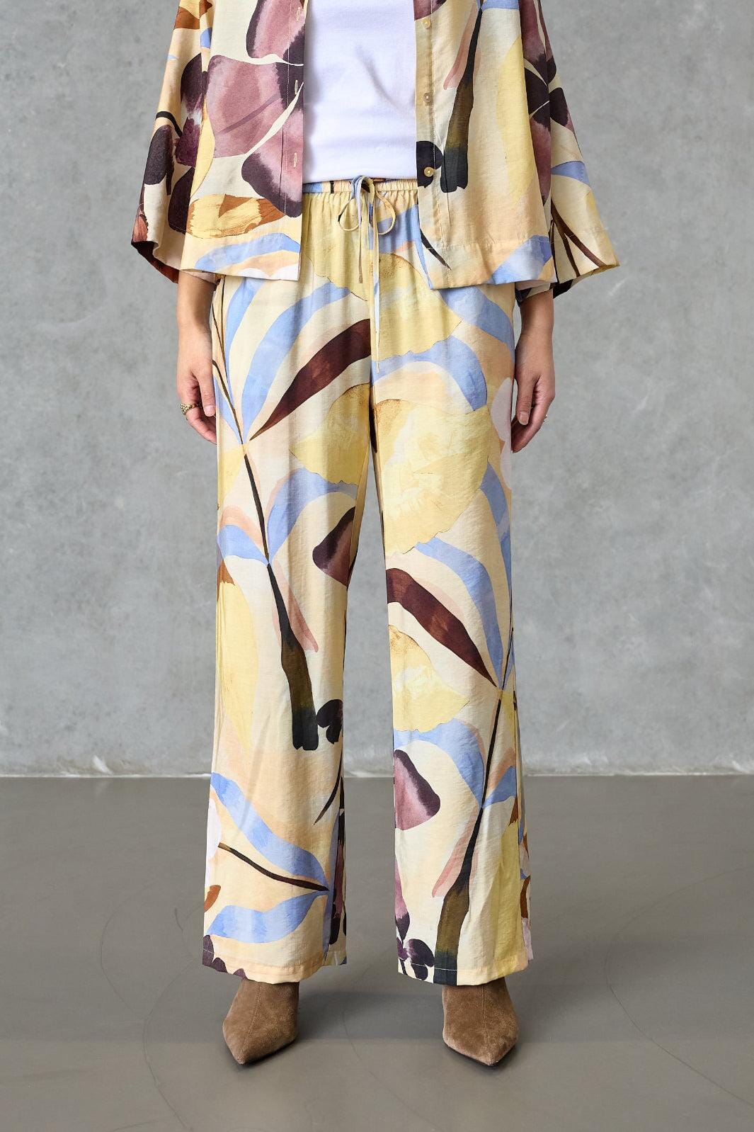 Hose von Love & Divine mit einem Blumenmuster in gelben, blauen, braunen und lila Nuancen. Die Hose hat eine lockere Passform und reicht bis zum Knöchel.