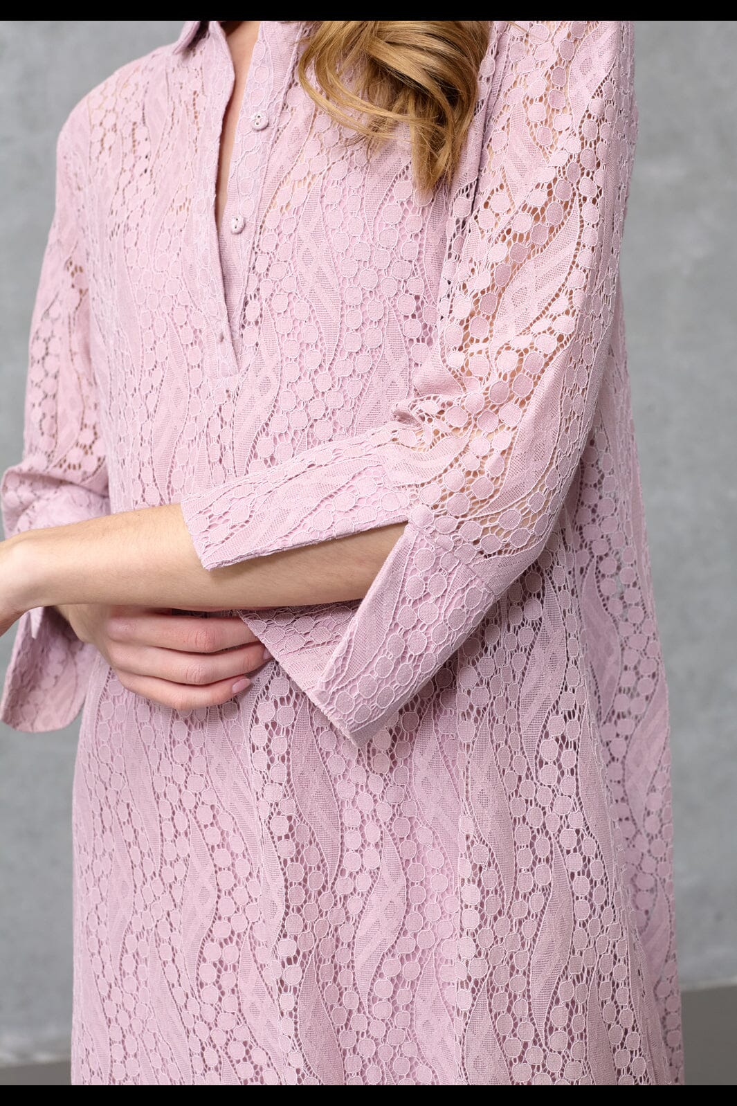 Spitzenkleid von Love & Divine in einem lila-pinken Farbton. Das Kleid hat einen Hemdkragen, Dreiviertelärmel und eine lockere Passform.