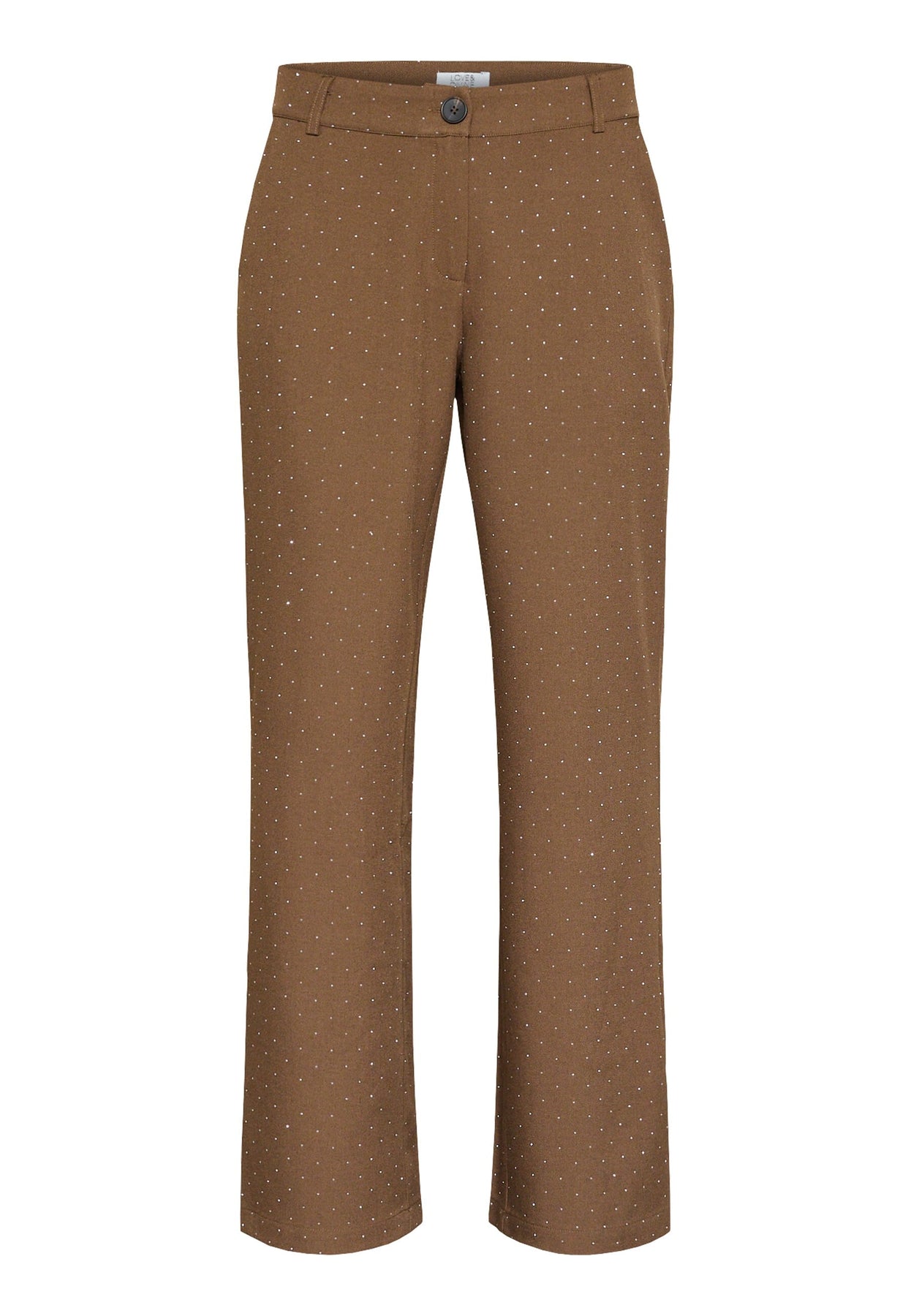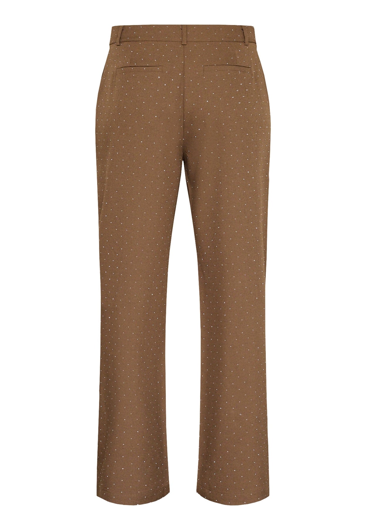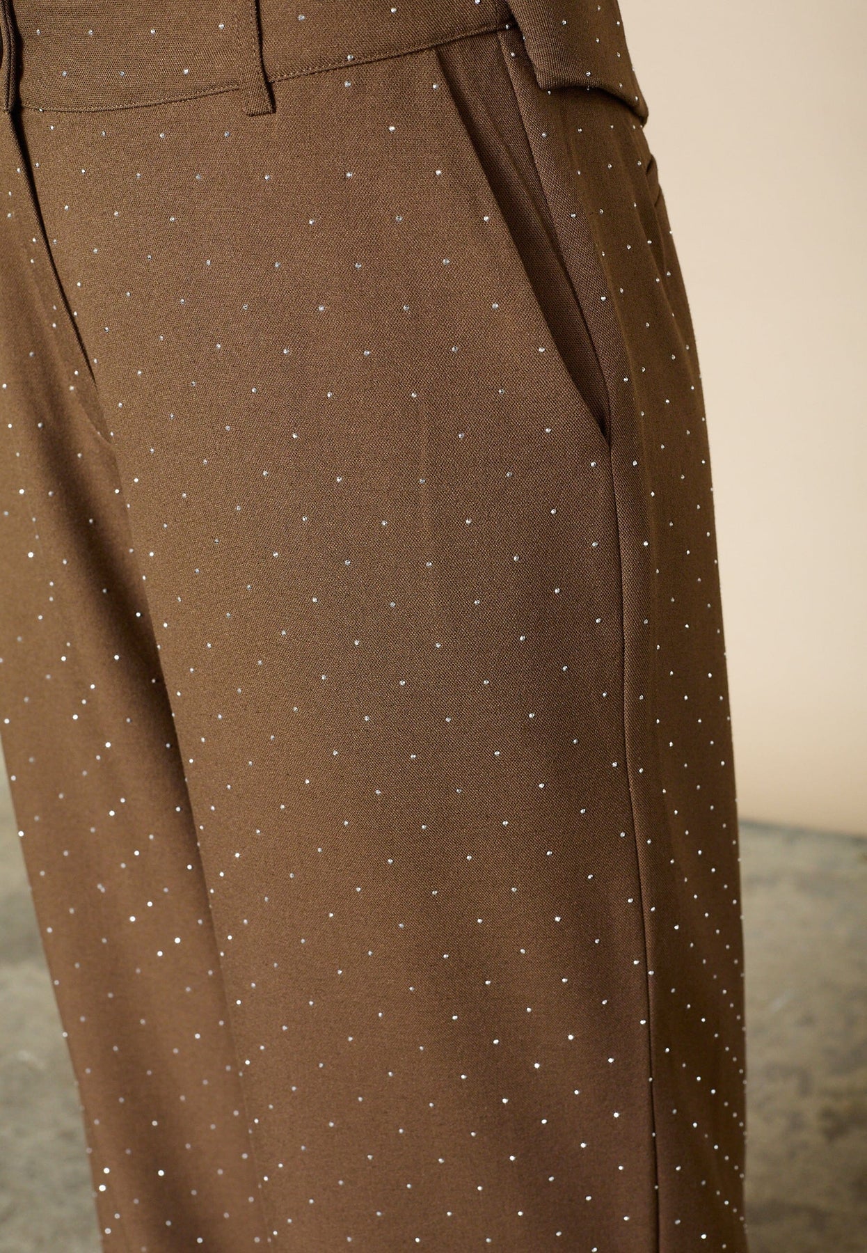 Braune Hose von Love & Divine mit kleinen Strassdetails über dem gesamten Stoff. Die Hose ist Teil eines Anzugs mit passendem Blazer.