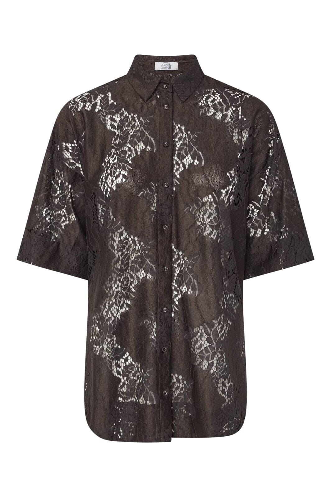 Dunkelbraunes Hemd von Love & Divine mit Spitze. Das Hemd hat eine lockere Passform, kurze Ärmel und einen klassischen Hemdkragen mit Knopfleiste vorne.
