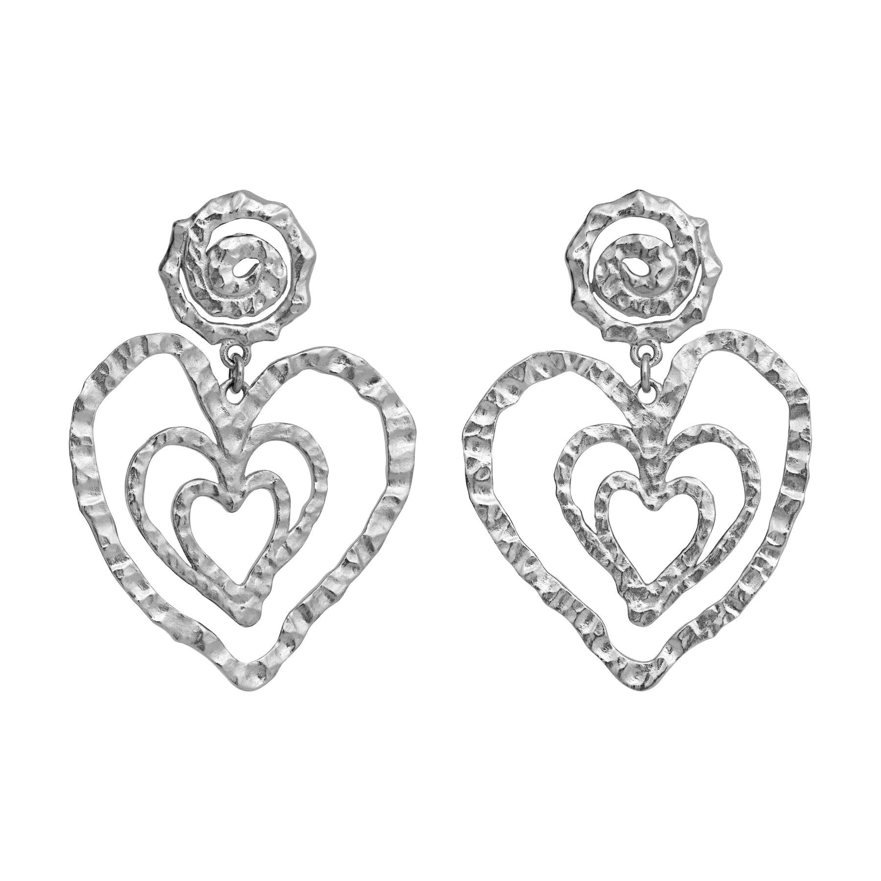 Ohrringe von Maanesten, gefertigt aus recyceltem Sterlingsilber mit überlappenden Herzformen und einer gehämmerten Oberfläche.
