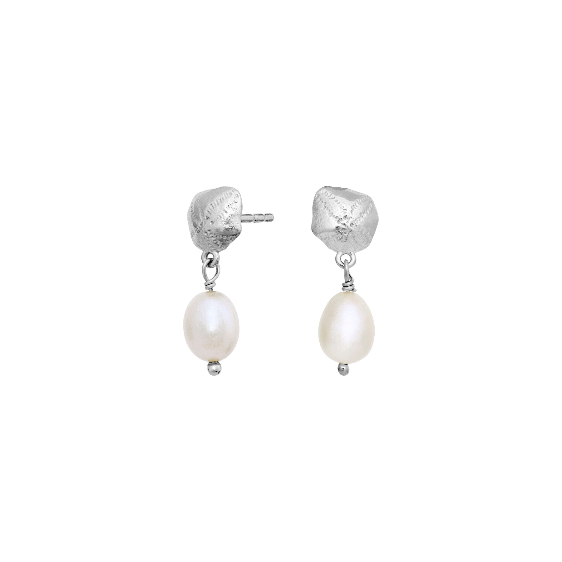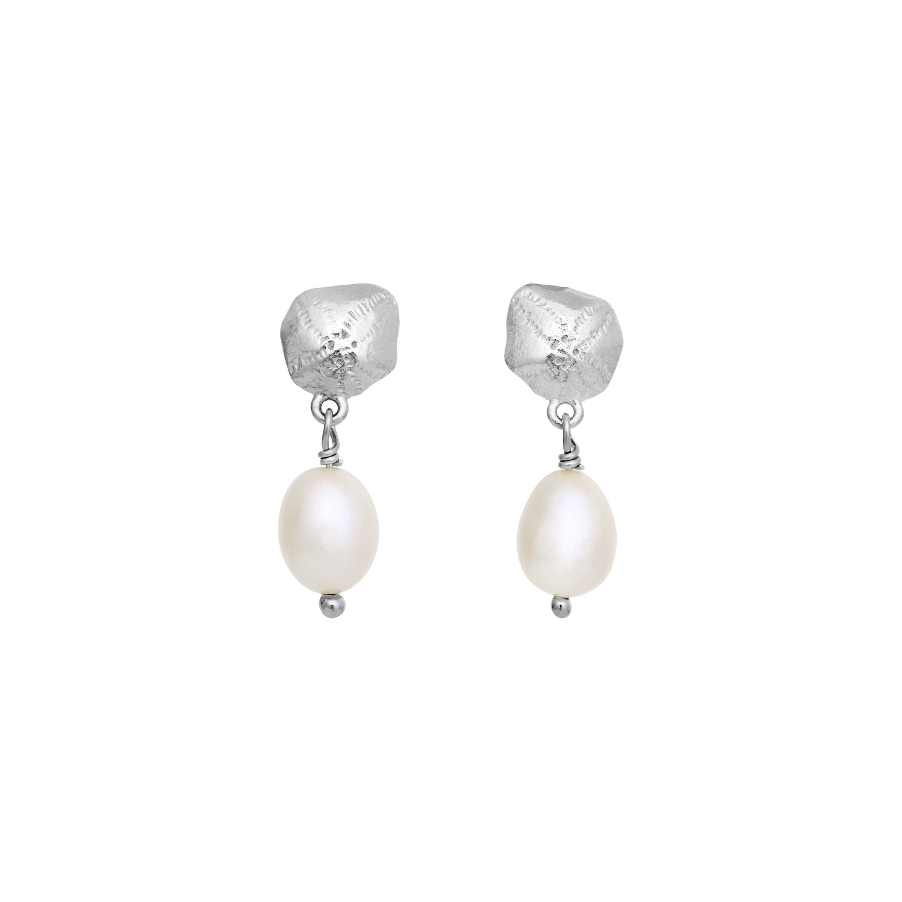 Ohrringe von Maanesten, gefertigt aus recyceltem Sterlingsilber. Das Design zeichnet sich durch eine unregelmäßige Metallstruktur und eine tropfenförmige Perle aus.