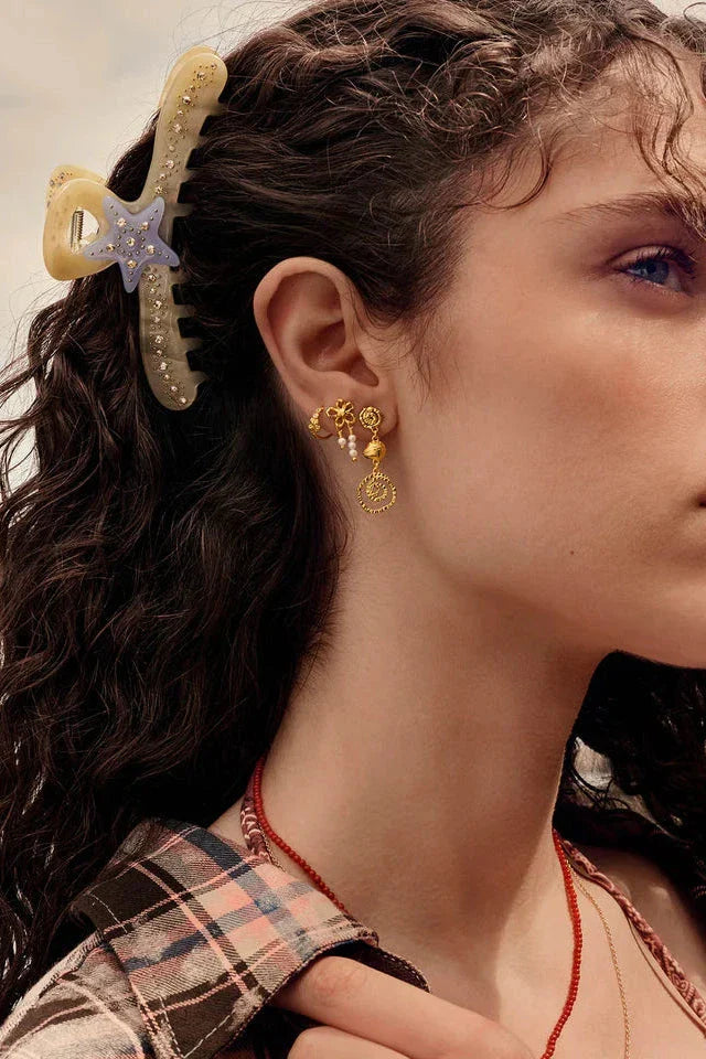 Haarspange von Maanesten in hellem Beige, inspiriert von Unterwassersternen. Diese Haarspange ist eine Hommage an die Seesterne mit einer blauen Seesternverzierung und kleinen, funkelnden Steinen.