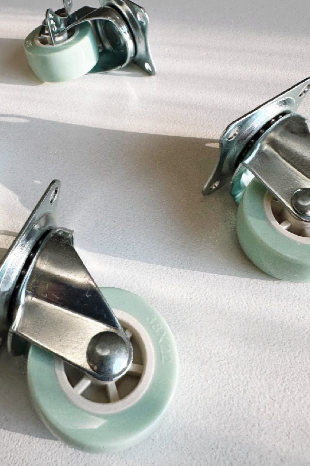 Räder von Made Crate in einem mintgrünen Farbton mit silberfarbenen Metallelementen. Sie sind als Zubehör für Made Crate-Aufbewahrungsboxen konzipiert und bieten einfache Mobilität im Zuhause.