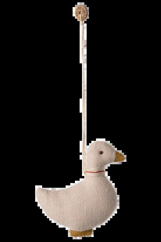Entenanhänger von Maileg aus beigem Leinen. Die Ente hat eine weiche Form mit einer kleinen roten Linie um den Hals und einer Schnur zum Aufhängen.