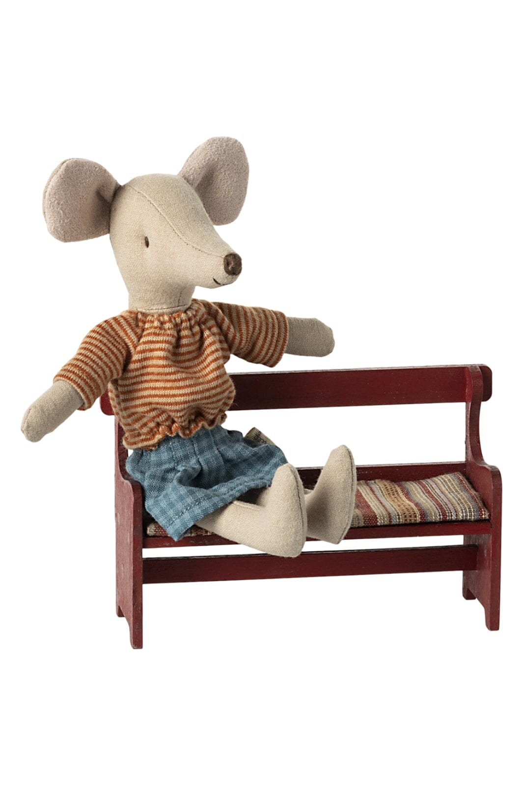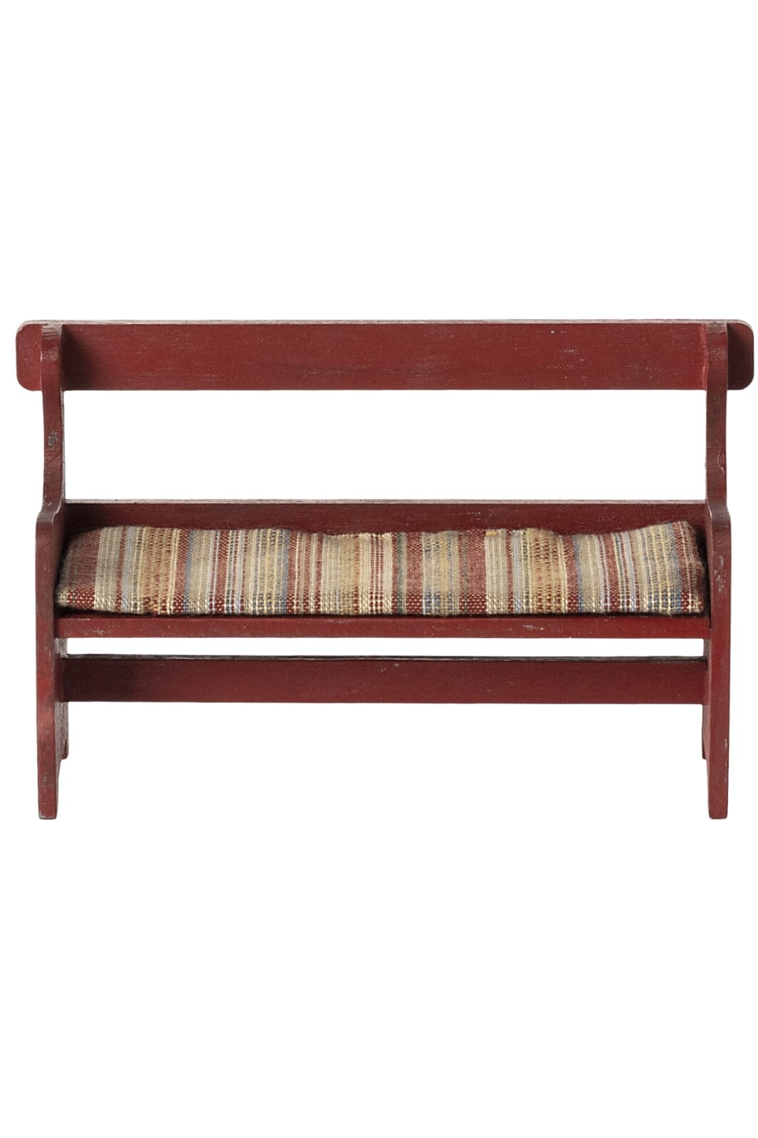 Eine rote Holzbank mit einem gestreiften Kissen von Maileg. Die Bank hat eine handgemalte Oberfläche und ist in der Größe für Maileg-Mäuse geeignet.