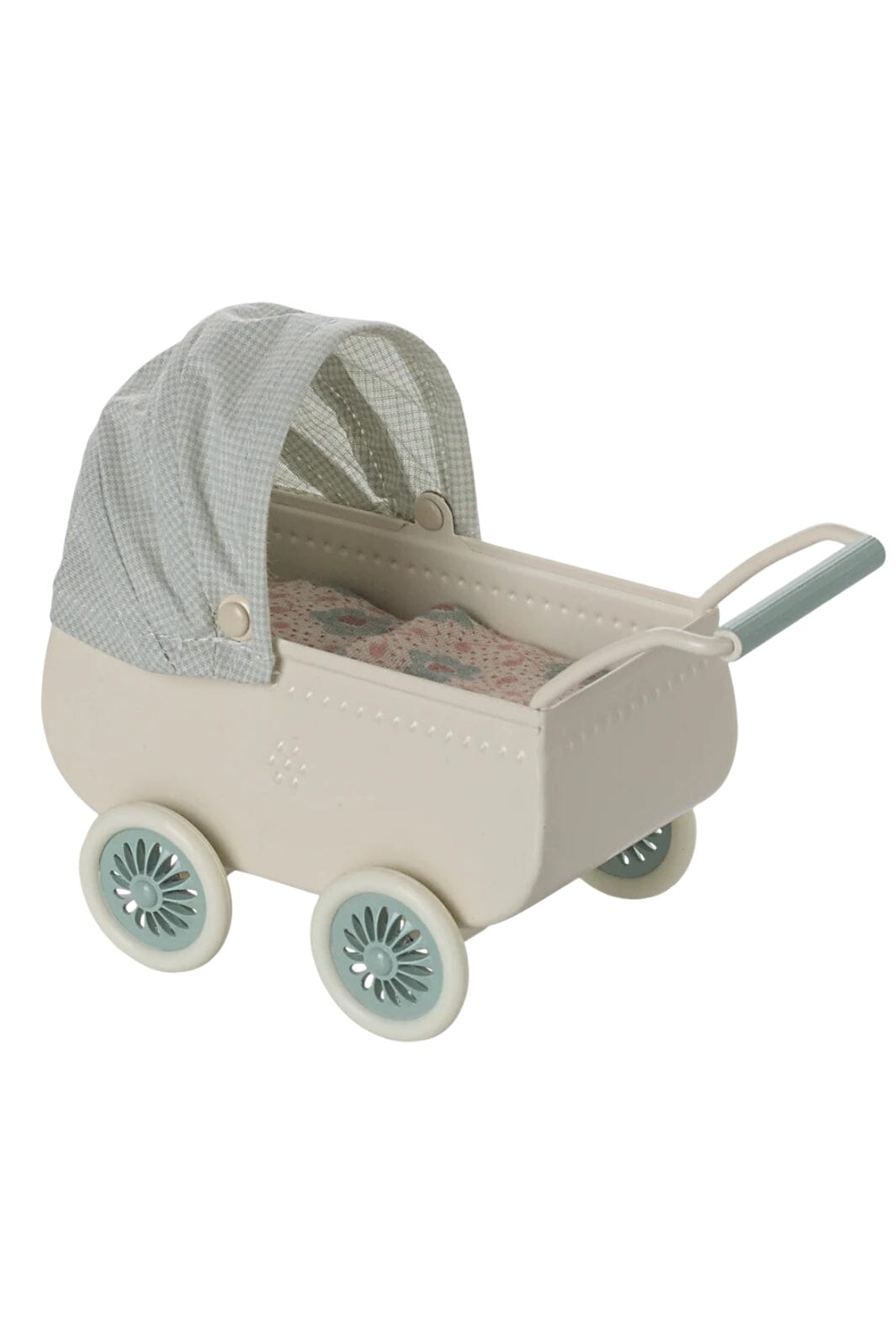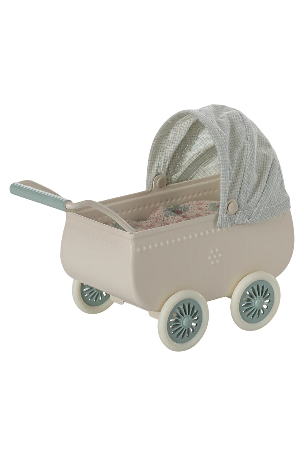 Mintgrüner Kinderwagen von Maileg mit Babymaus, Schlafsack und Matratze. Der Kinderwagen hat eine helle Basis mit mintgrünen Rädern und einem leichten Stoffdach.