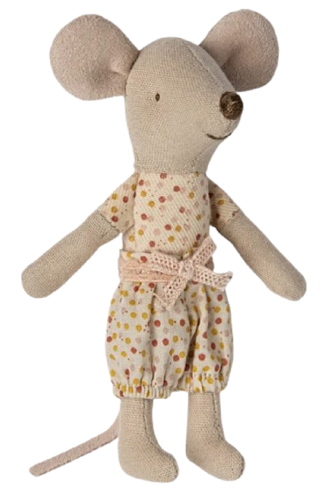 Eine kleine Stoffmaus von Maileg mit einer Streichholzschachtel als Bett. Die Maus trägt einen gepunkteten Anzug mit Schleife und kommt mit gestrickter Bettwäsche für die Streichholzschachtel.