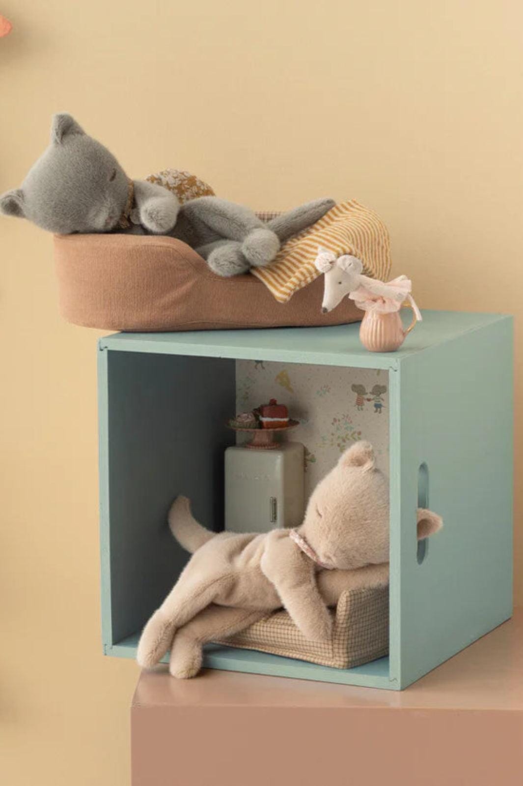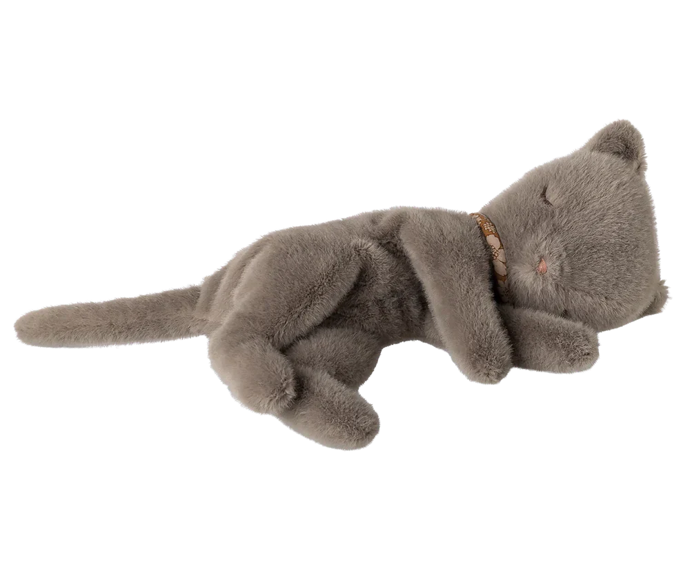Eine graue Plüschkatze von Maileg in schlafender Position. Die Katze besteht aus Polyester und hat gestickte Gesichtszüge mit geschlossenen Augen.