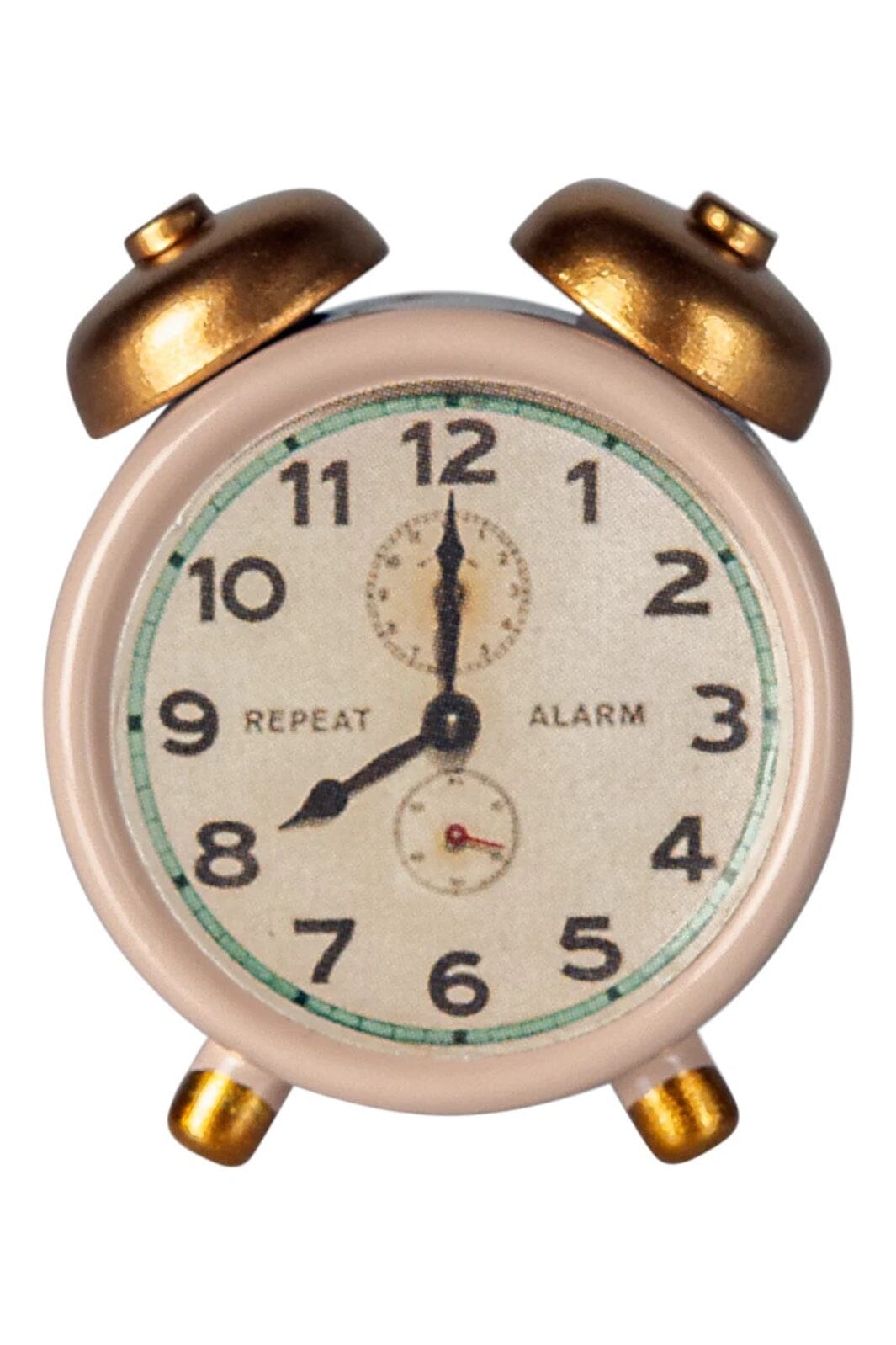 Ein Wecker von Maileg in Rosa mit goldenen Details. Die Uhr hat eine klassische Form mit zwei Glocken oben und einem klaren Zifferblatt mit Zahlen und Alarmfunktion.