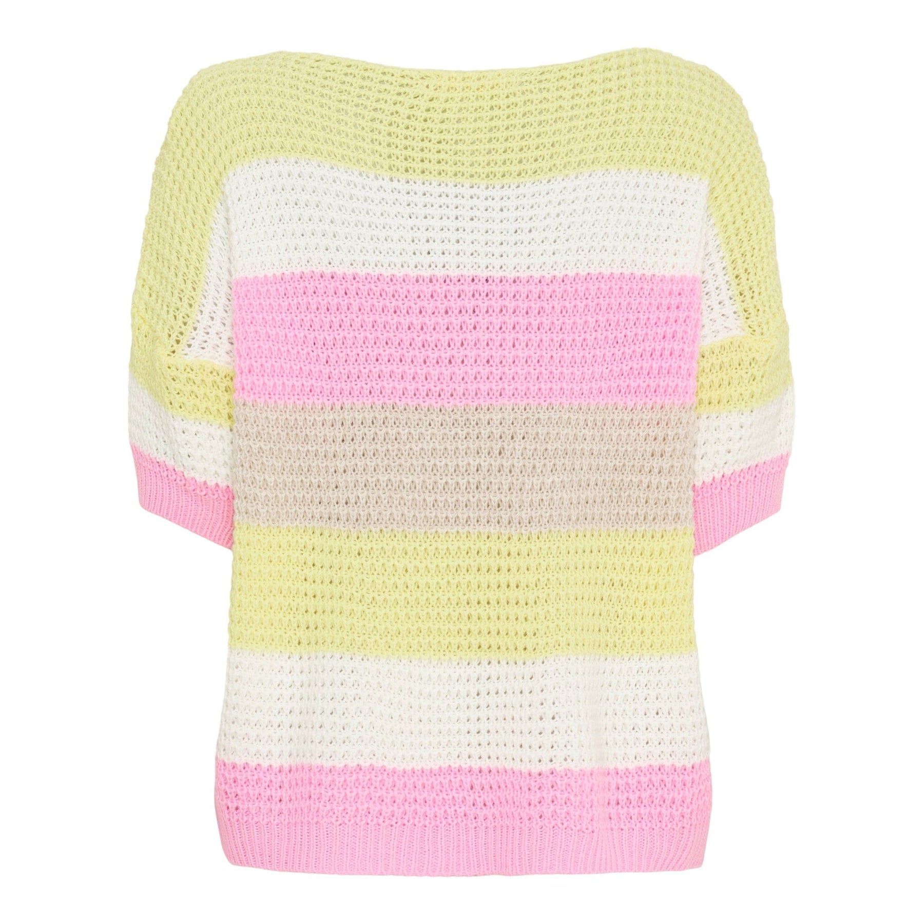 Gestreifte Strickbluse von Marta Du Chateau mit V-Ausschnitt und 3/4-Ärmeln. Die Bluse hat Streifen in gelben, pinken, weißen und beigen Nuancen und eine normale Passform.