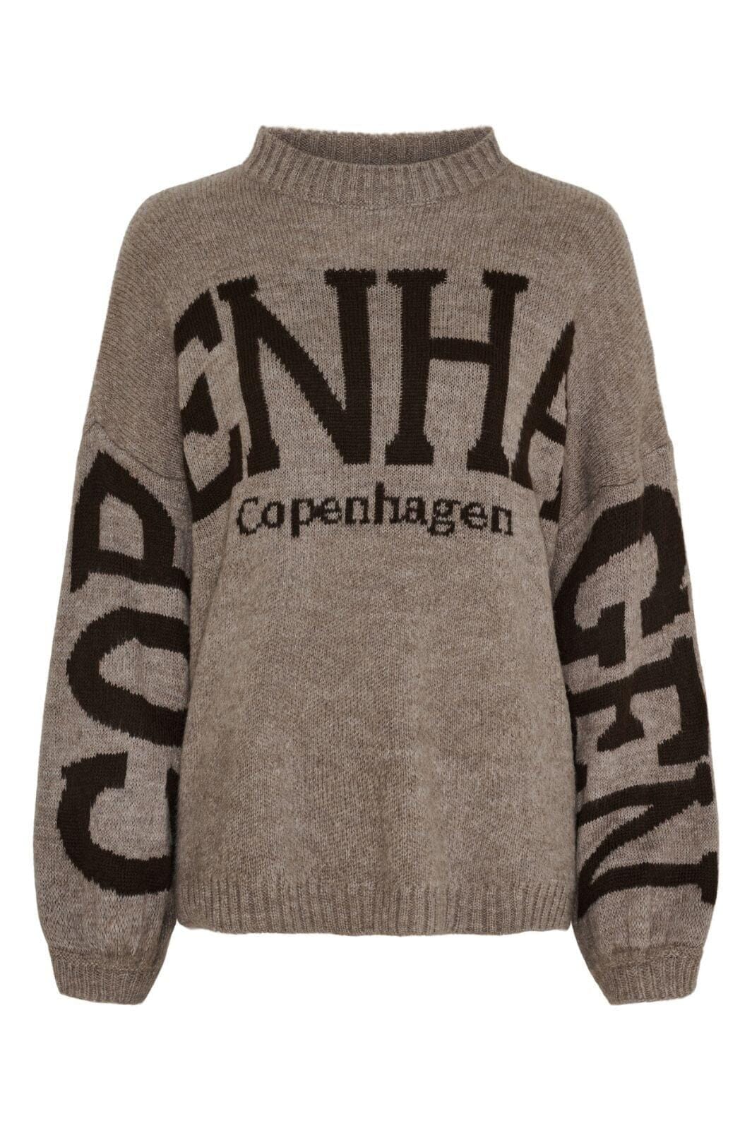 Strickpullover von Marta Du Chateau in einem dunklen Braunton mit großem Copenhagen-Print auf der Vorderseite und den Ärmeln. Der Pullover hat eine oversized Passform und einen runden Halsausschnitt.