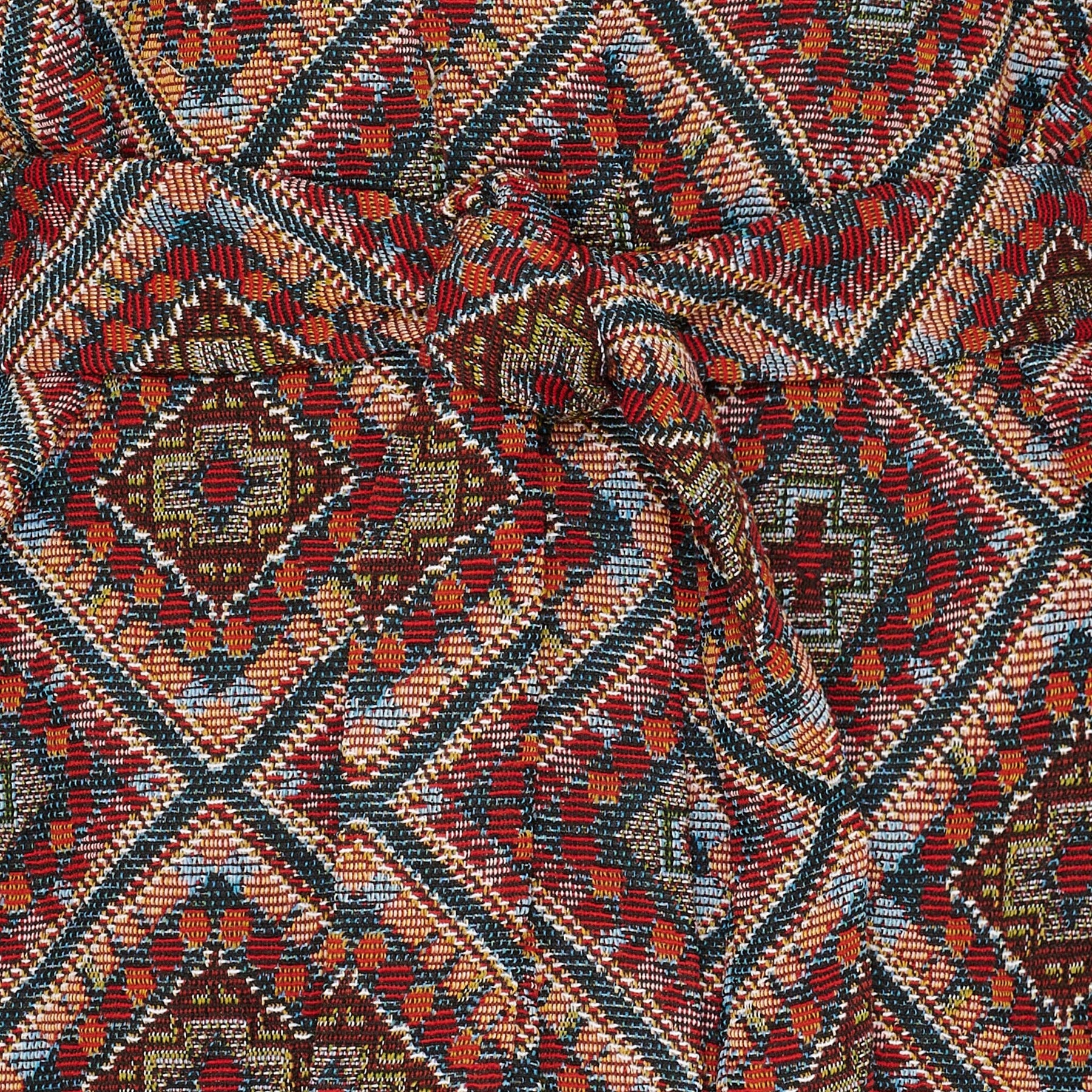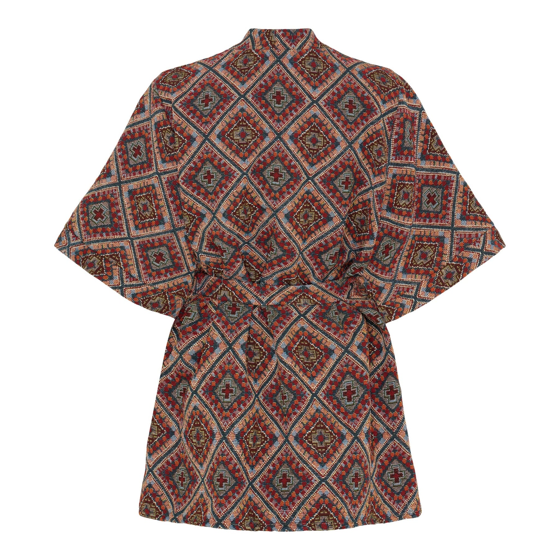 Kimono von Marta Du Chateau mit geometrischem Muster in burgunder, marineblau und orange Nuancen. Die breiten Ärmel und der lockere Schnitt bieten eine entspannte Passform mit viel Bewegungsfreiheit.
