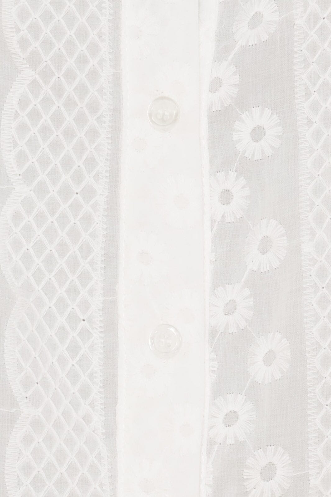 Weiße Bluse von Marta Du Chateau mit Stickerei und Spitzen-Details. Die Bluse hat einen Hemdkragen und Knöpfe bis nach unten. Die langen Ärmel haben Rüschen am Rand.