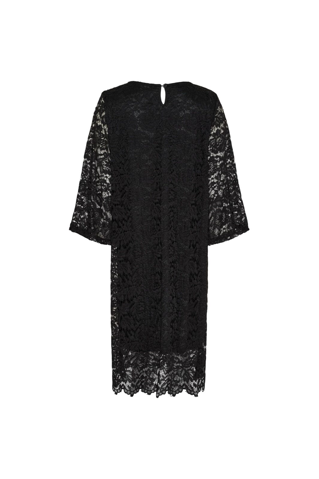 Schwarzes Spitzenkleid von Marta Du Chateau mit knielanger Länge. Das Kleid hat eine lockere Passform mit 3/4-Ärmeln und einem runden Ausschnitt. Ein Knopf im Nacken erleichtert das An- und Ausziehen.