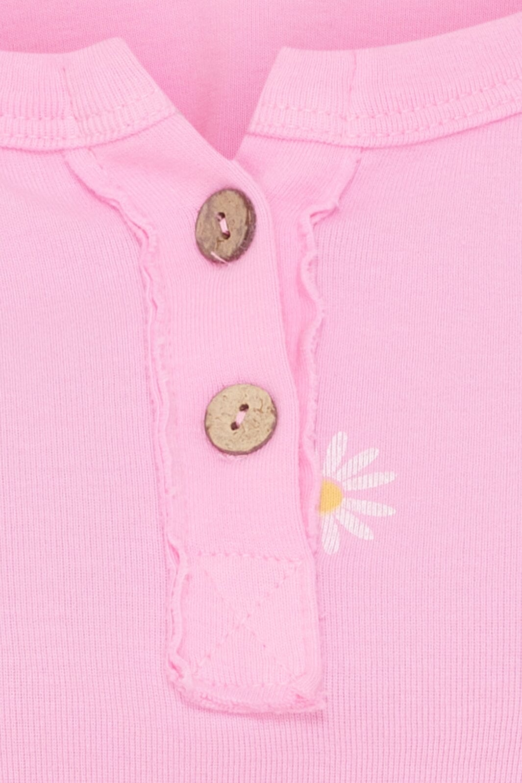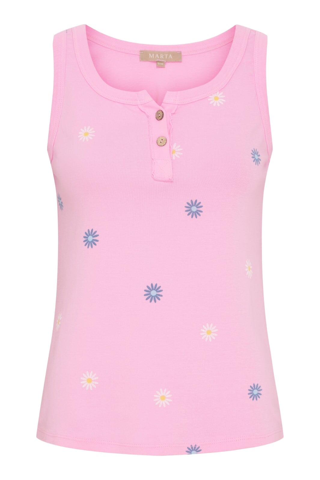 Rosa Top von Marta Du Chateau mit Blumenmuster. Die Top hat einen runden Halsausschnitt mit drei Knöpfen und Rüschendetails. Sie besteht aus einer weichen Baumwollmischung.