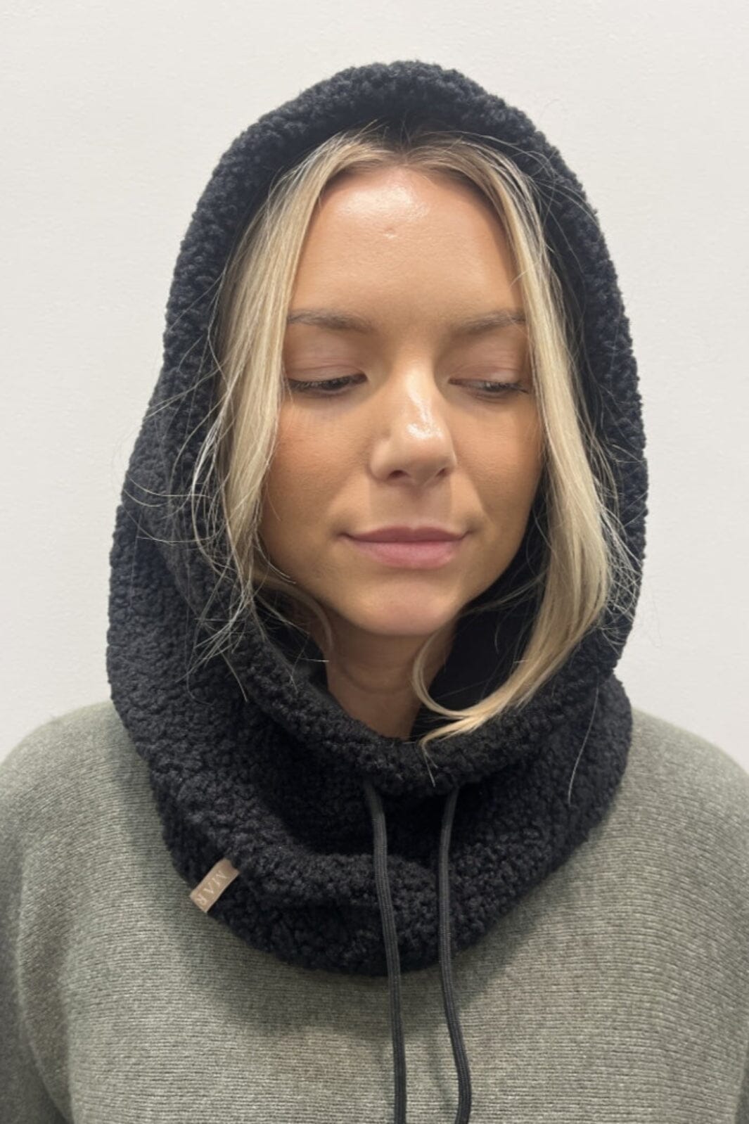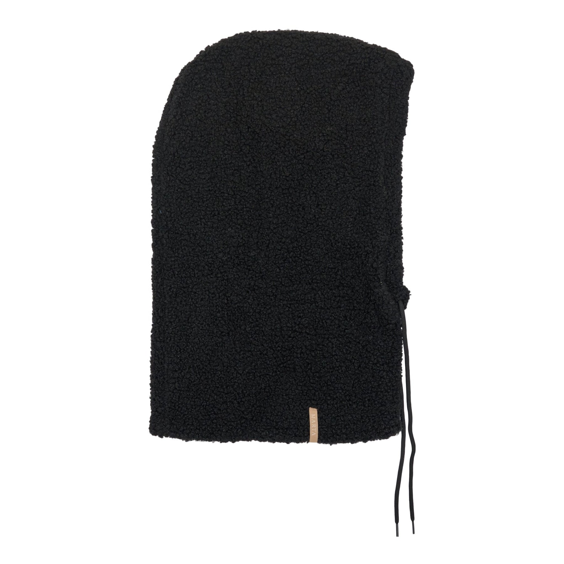 Schwarze Balaclava von Marta Du Chateau mit einer weichen, flauschigen Oberfläche. Sie hat eine praktische Schnur am unteren Ende zur Anpassung der Passform und bedeckt sowohl Kopf als auch Hals.