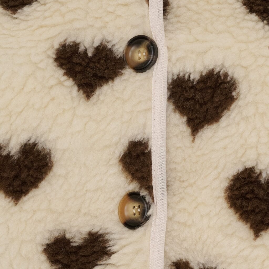 Weste von Marta Du Chateau in Creme mit dunkelbraunen herzförmigen Mustern. Die Weste hat dunkle Kanten entlang der Seiten und eine Knopfleiste vorne.