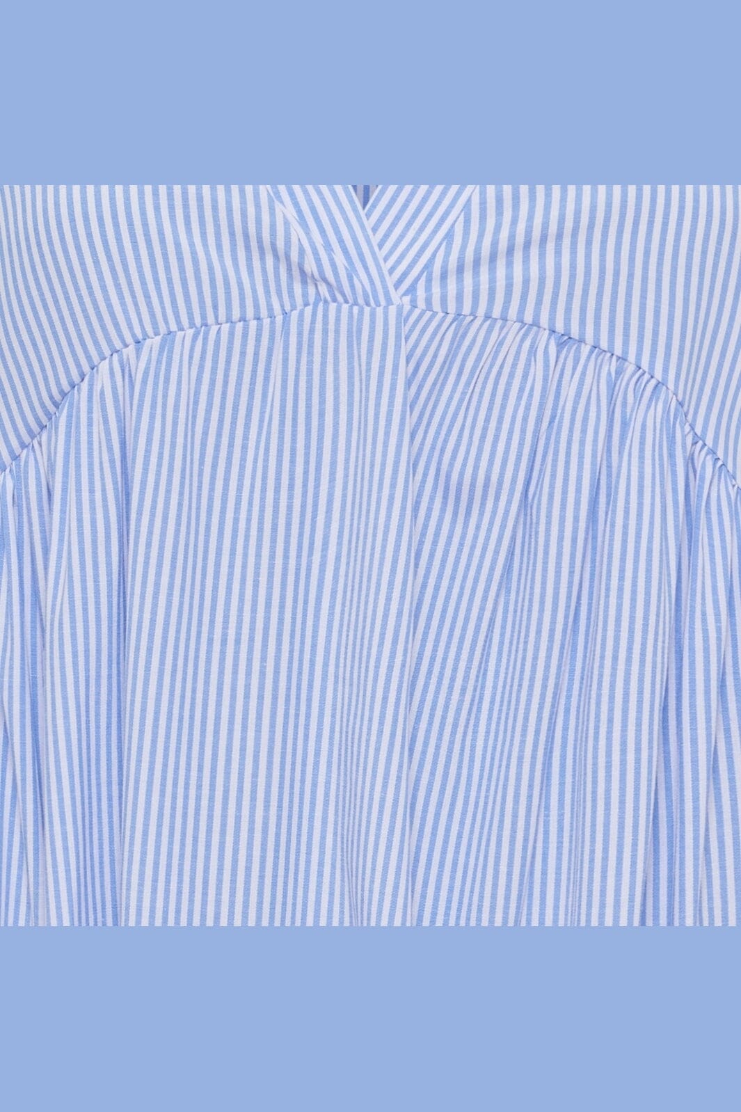 Gestreiftes Kleid von Marta Du Chateau in Hellblau und Weiß. Das Kleid hat ein Stufendesign mit Rüschen an den Ärmeln und V-Ausschnitt.