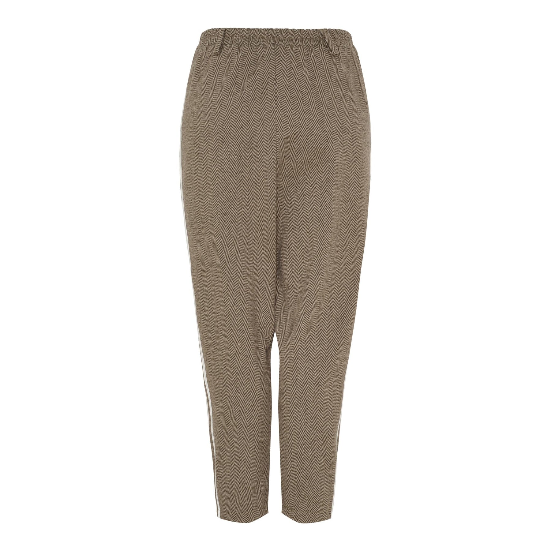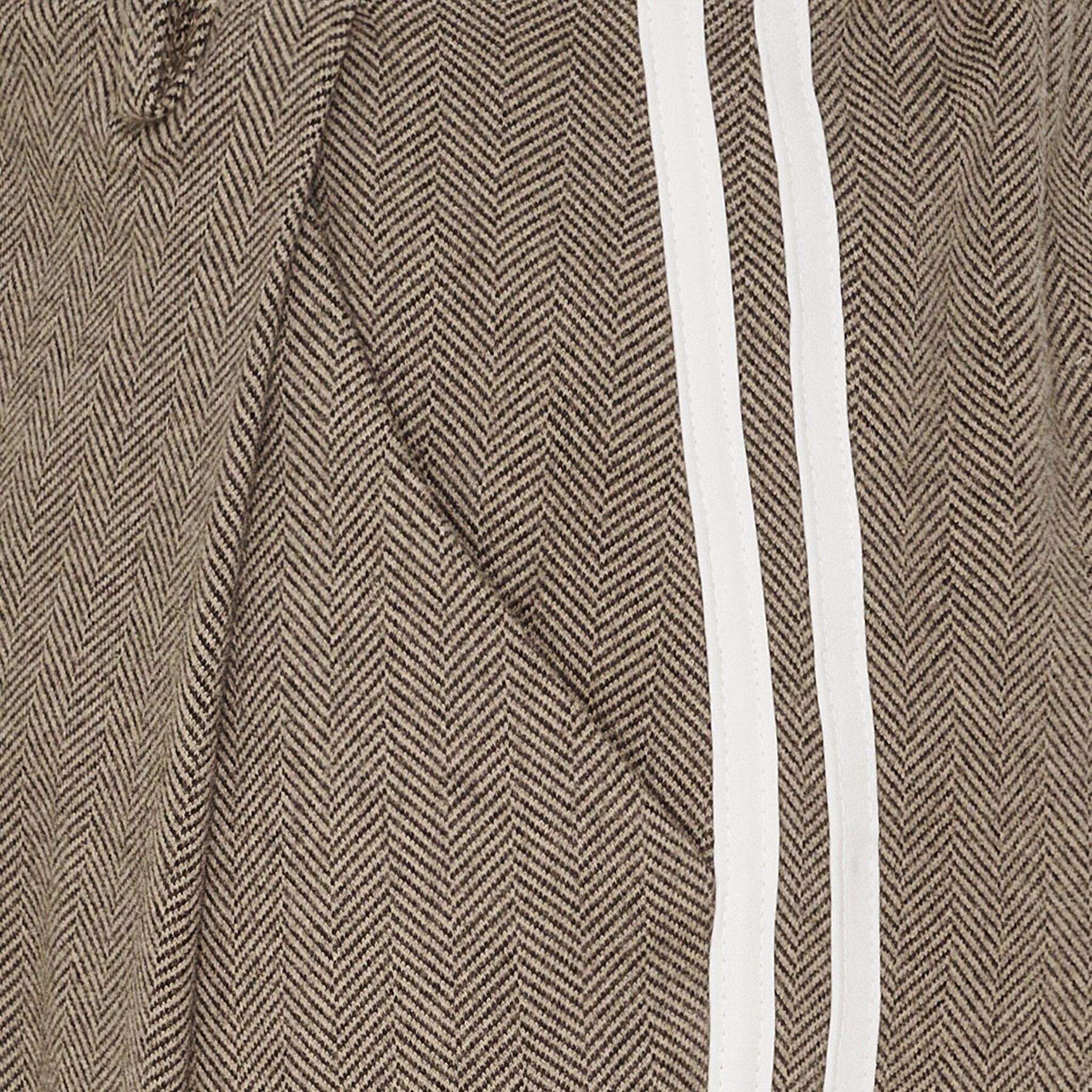 Braune Hosen von Marta Du Chateau mit weißen Streifen entlang der Beine. Die Hosen haben eine lockere Passform und reichen bis zur Mitte der Wade. Sie haben sowohl einen Reißverschluss, einen Gummizug als auch Knöpfe in der Taille.