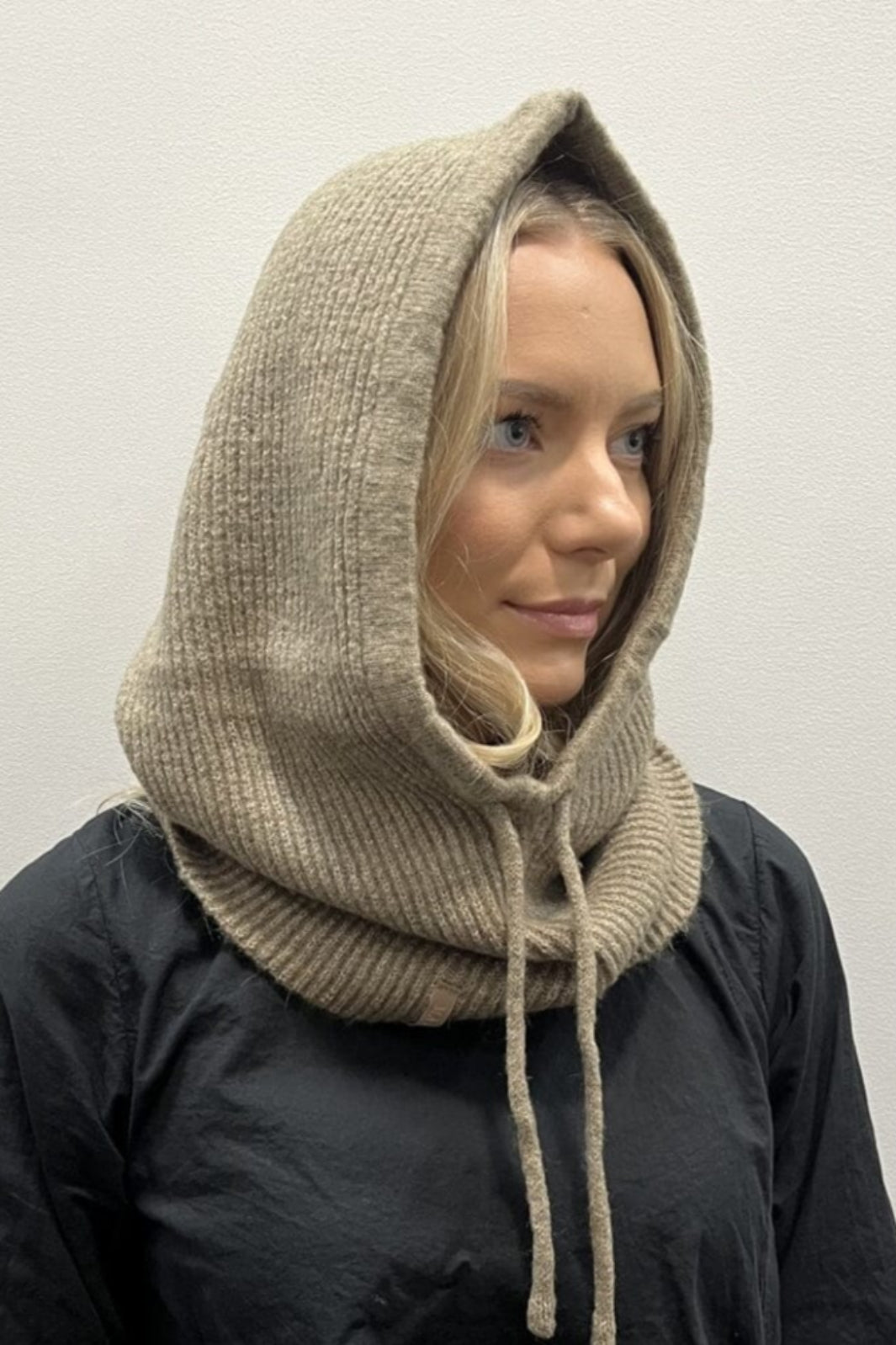 Balaclava von Marta Du Chateau in einem erdigen Fango-Ton. Sie hat eine gerippte Textur und verstellbare Schnüre vorne, die sie praktisch für Outdoor-Aktivitäten machen.
