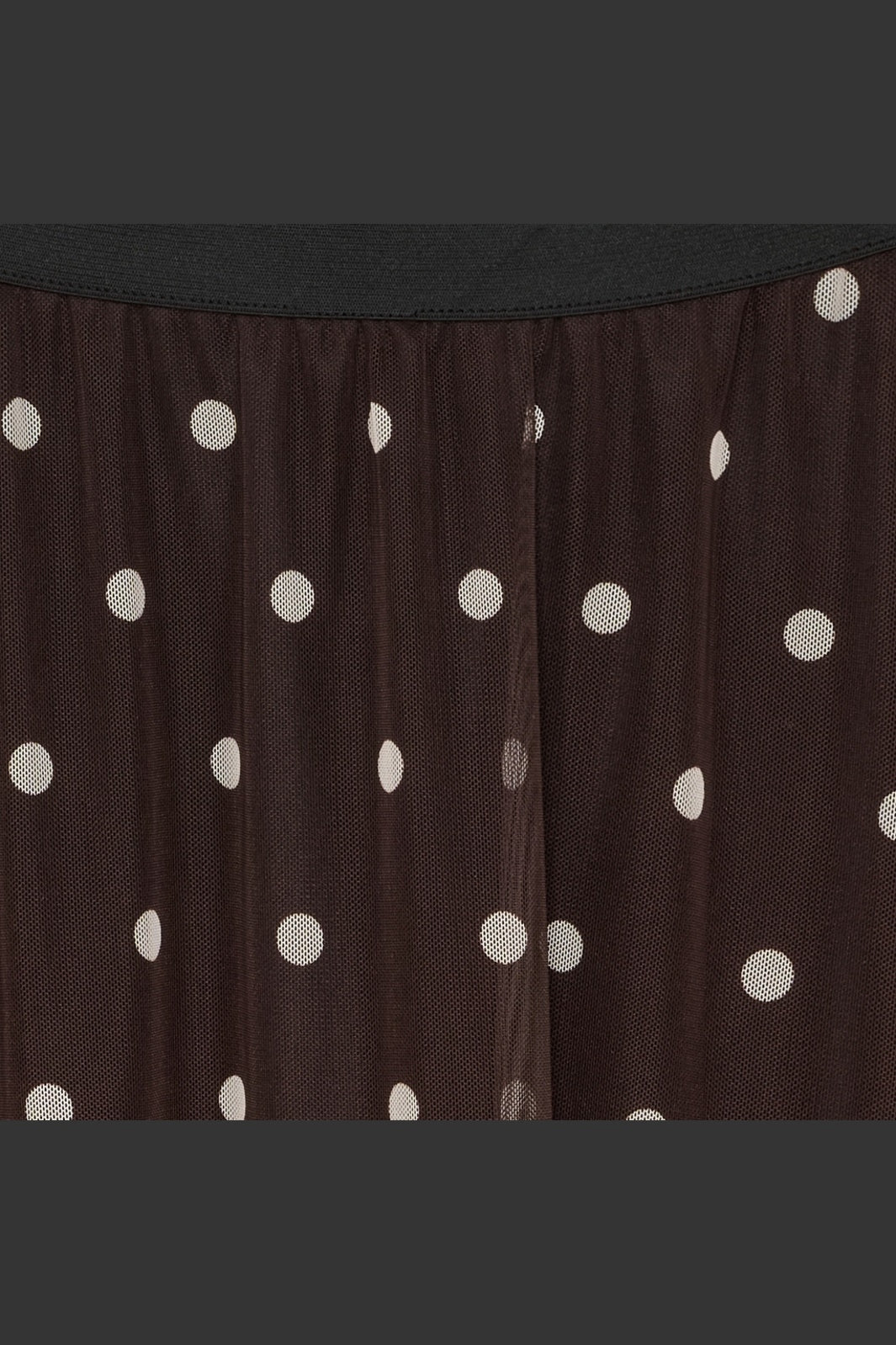 Brauer Rock von Marta Du Chateau mit weißen Punkten. Er besteht aus leichtem Polyester mit elastischem Bund und reicht bis zur Mitte der Wade.