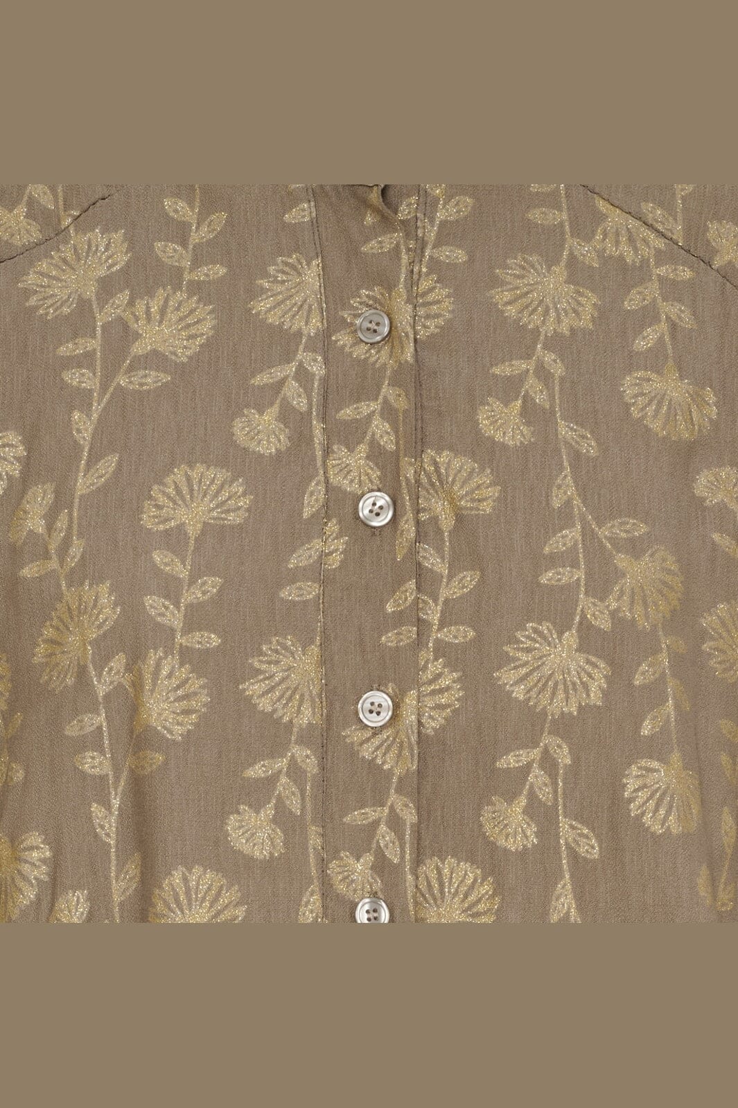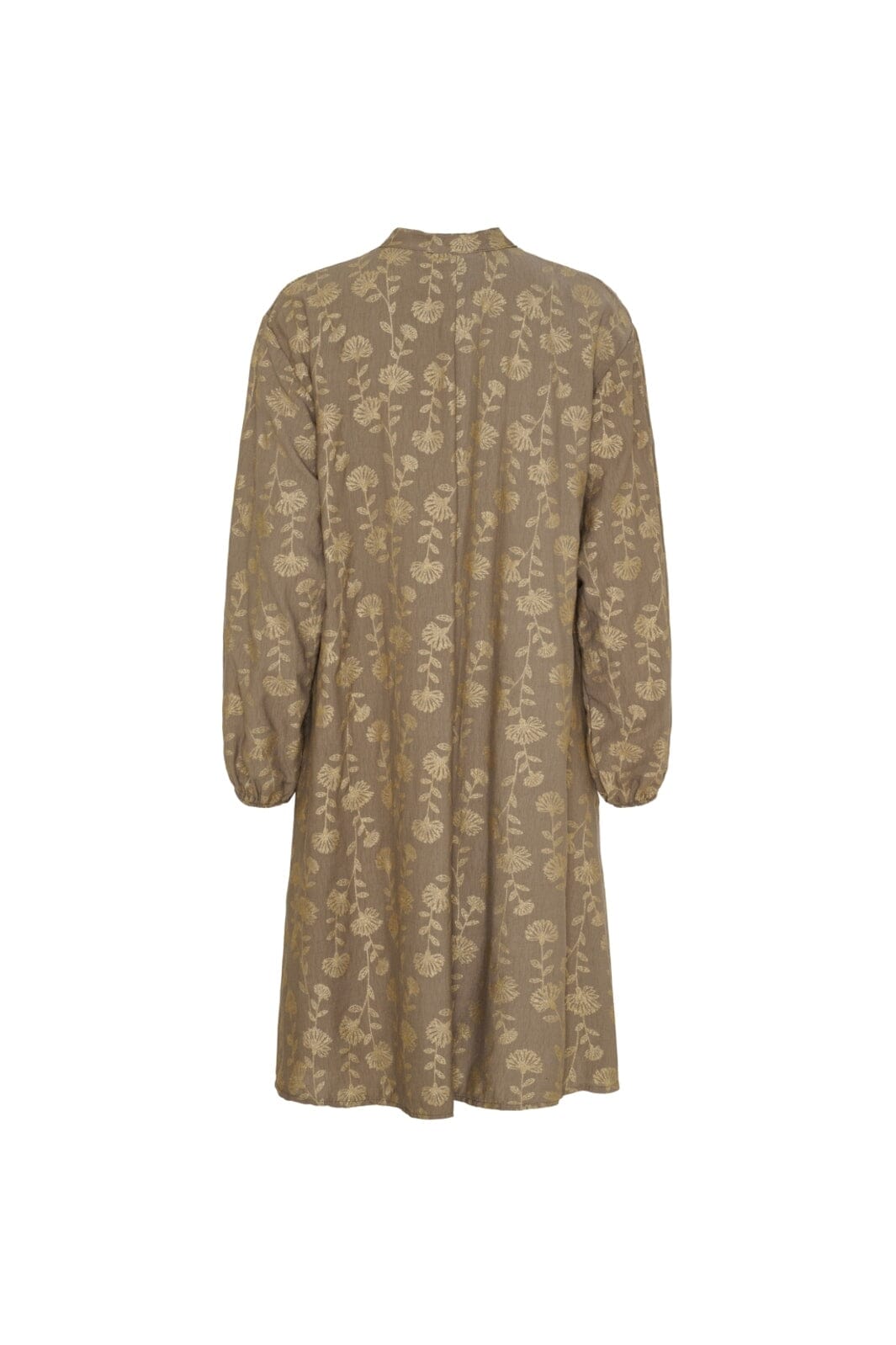 Knielanges Kleid von Marta Du Chateau in Braun mit goldenem Blumenmuster. Das Kleid hat lange Ärmel mit Gummizug und durchgehende Knopfleiste mit einem kleinen Kragen.