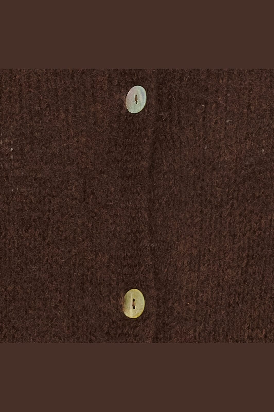 Braune Cardigan von Marta Du Chateau mit Rundhalsausschnitt und Knopfleiste. Aus einer weichen Mischung aus natürlichen und synthetischen Fasern mit 3/4-Ärmeln gestrickt.
