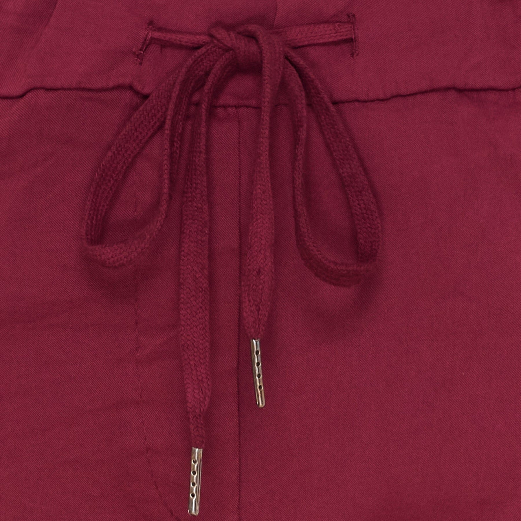 Bordeauxfarbene Hosen von Marta Du Chateau mit Schnürung in der Taille. Die Hosen haben eine reguläre Passform und zwei Vordertaschen. Sie sind knöchellang mit umgeschlagenen Hosenbeinen.