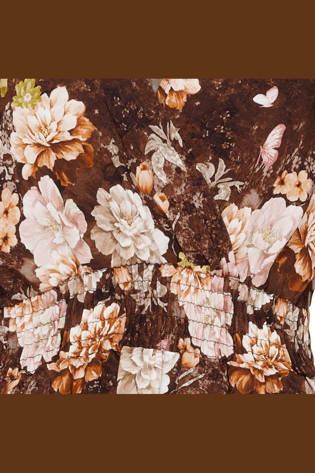 Braunes Kleid von Marta Du Chateau mit Blumenmuster. Das Kleid hat einen V-Ausschnitt, Puffärmel und einen Smock in der Taille. Es reicht bis zur Mitte der Waden und hat dekorative Nähte und Rüschen.