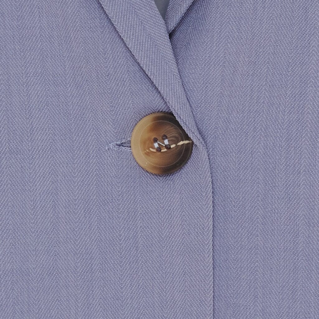 Ein hellblauer Blazer von Marta Du Chateau mit klassischem Reversdesign und einreihigem Knopfverschluss. Der Blazer hat zwei Fronttaschen mit Klappen.