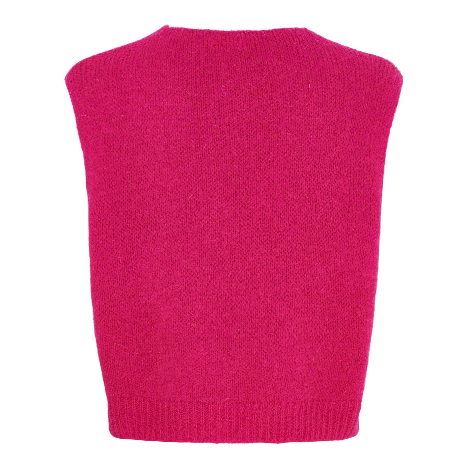 Tiefe rosa Weste von Marta Du Chateau mit V-Ausschnitt und geripptem Saum. Sie ist aus einer weichen Mischung aus Mohair, Wolle, Polyamid und Acryl gestrickt.